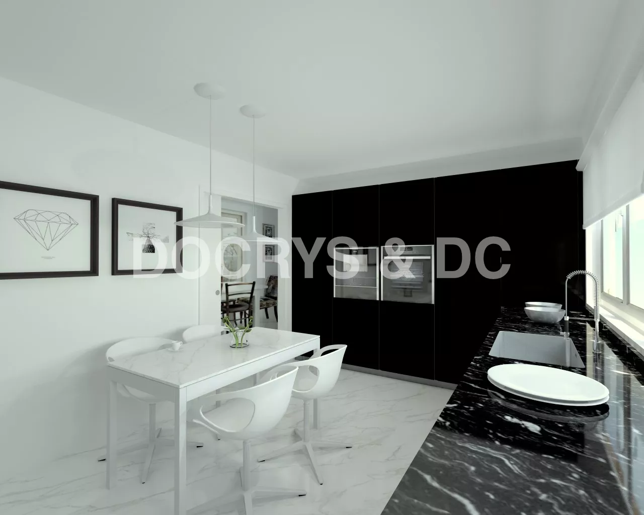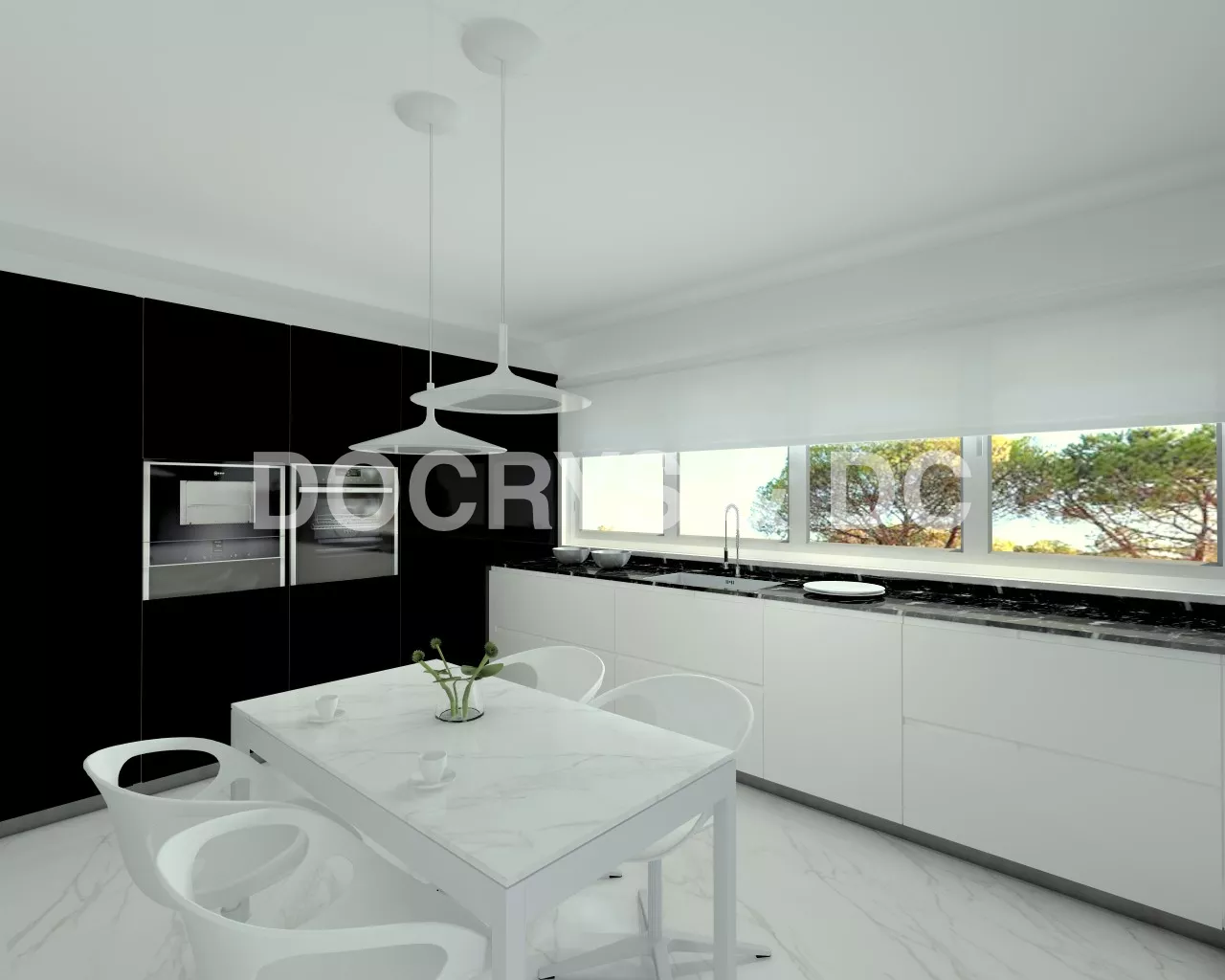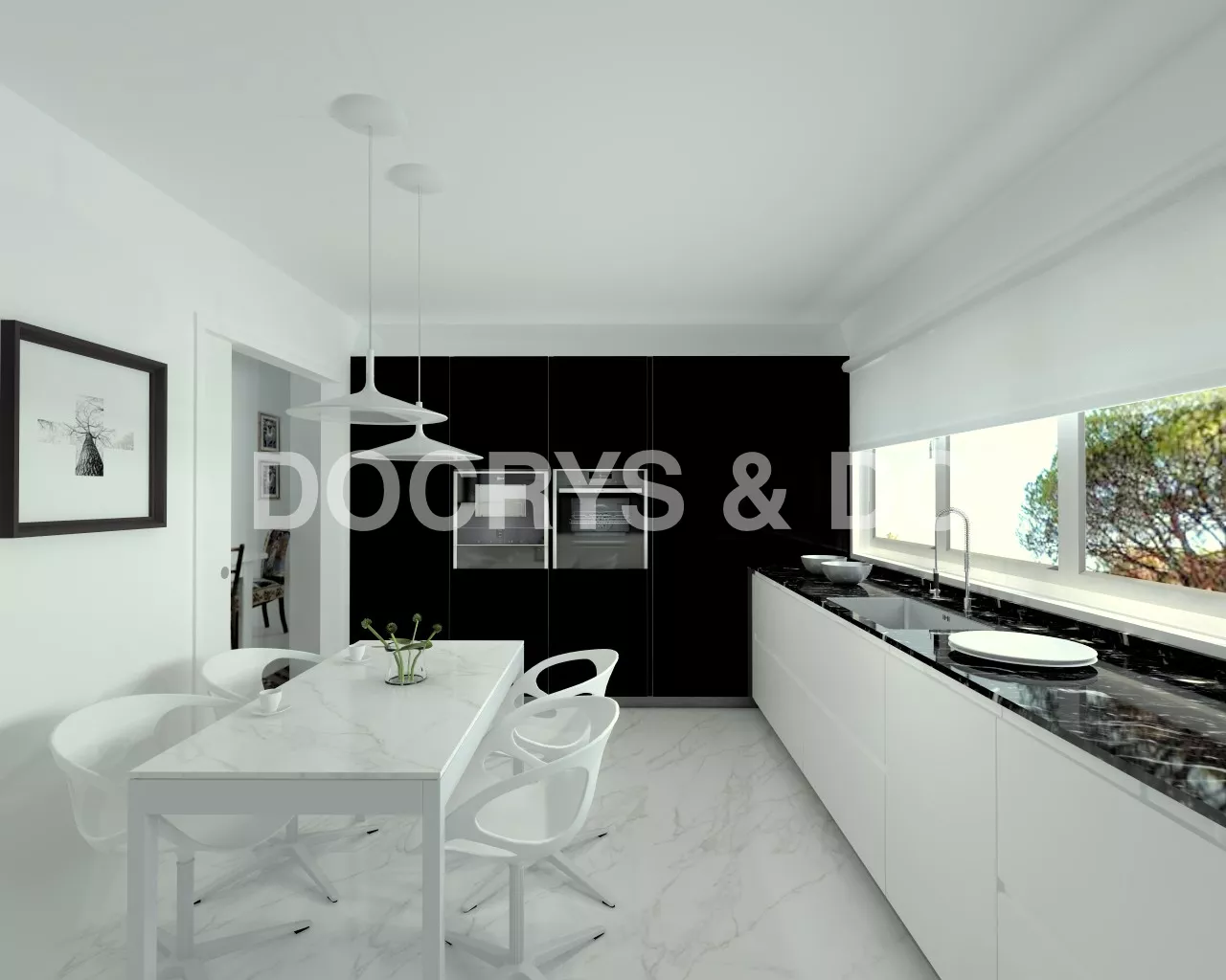 Una forma de ganar estilo y almacenaje en una cocina es la integración de módulos de columna. Para estos, se ha utilizado el modelo Line Negro de Santos frente al modelo Intra Blanco Mate que envuelve al resto de mobiliario. El ligero contraste de sus tonos añade viveza y modernidad a la estancia, mientras que la ausencia de tiradores, la coherencia geométrica y la unidad óptica de sus muebles ponen en manifiesto el perfil minimalista de esta cocina. Para su encimera, se ha aplicado un Granito Cheyenne de Naturamia que junto a la mesa comedor también de granito, otorgan ese toque de elegancia y distinción en el conjunto. La cocina de perfil minimalista presenta una estructura geométrica y compacta, lo que permite incorporar otros elementos como mesas y sillas (en este caso, la mesa y el suelo comparten diseño), haciendo de la cocina un lugar perfecto para las comidas del día a día y donde pasar momentos agradables en familia o con amigos. Los electrodomésticos están incorporados en el amplio panel del fondo, por lo que no restan espacio.