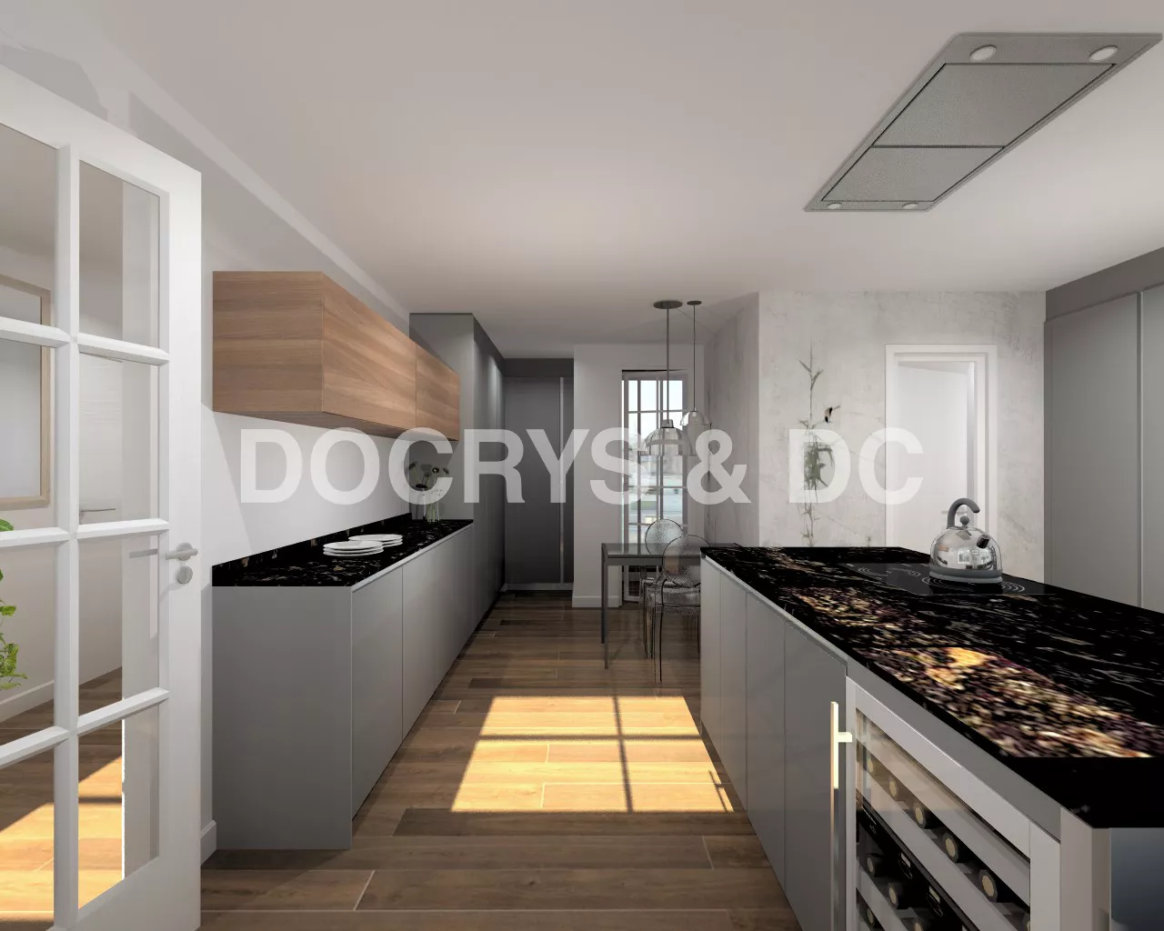 Junto a la pared se ha situado una barra que comparte diseño con la encimera, sirviendo como una superficie útil para realizar diversas tareas culinarias.