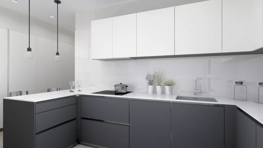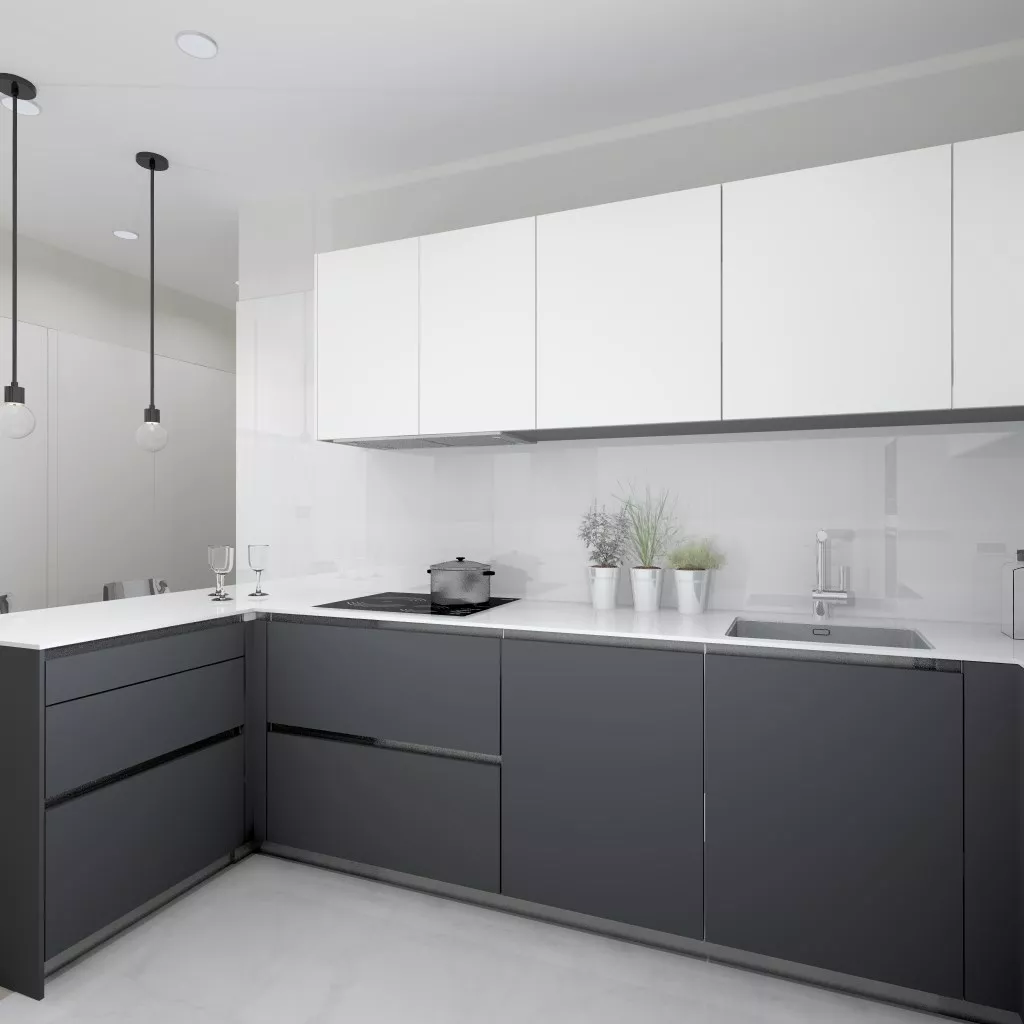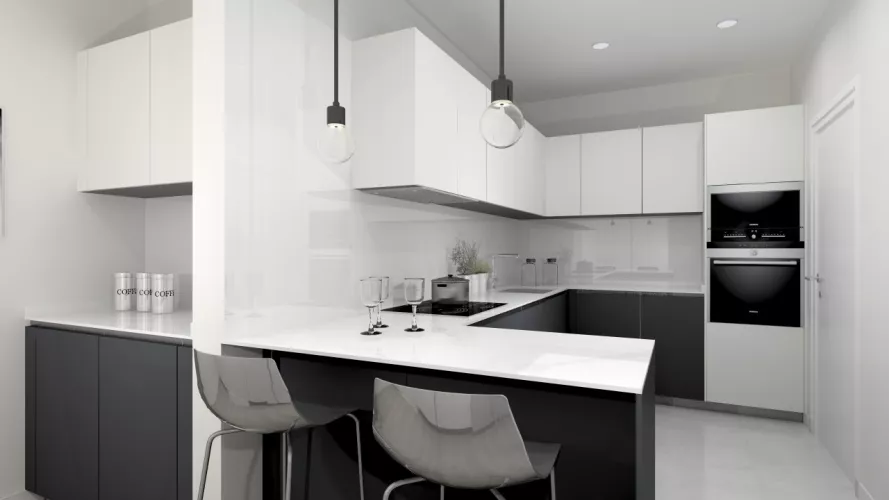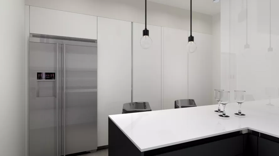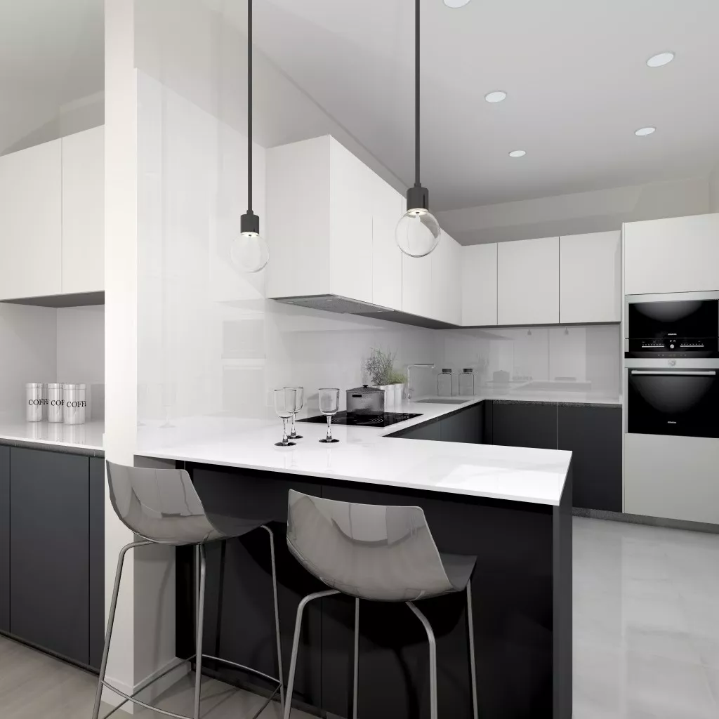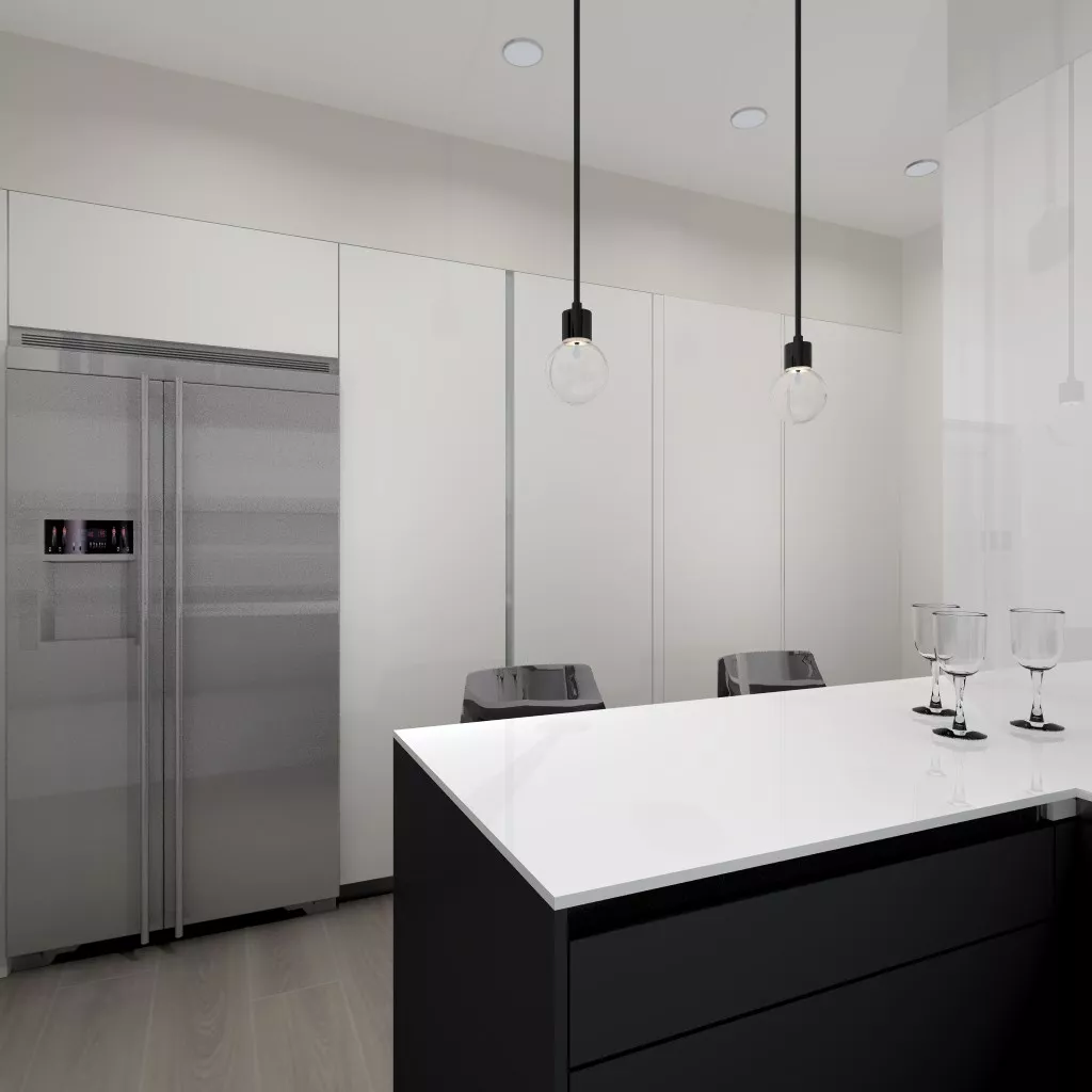 Creamos en este proyecto 3D de cocina un ambiente amplio con una cómoda barra incluida, perfecta para hacer comidas más rápidas. El blanco actúa como un elemento arquitectónico que envuelve la mayor parte de la estancia. Como contrapunto, se aplica un Laminado en Negro que consigue crear un ambiente inspirador y elegante a través de sus muebles bajos. En forma de U, esta cocina de Santos se extiende en uno de sus lados gracias a su barra recubierta por una radiante encimera Neolith Artic White. Su iluminación con focos LED contribuye aumentar la sensación de amplitud tanto del espacio como de sus volúmenes. Los tabuerete de metal aportan un toque moderno que combina con los colores elegidos a la perfección y hacen un tándem perfecto con el acabado de acero de los electrodomésticos. Los materiales utilizados en esta cocina Santos: LINE LAMINADO NEGRO LINE LAMINADO BLANCO NATA ENCIMERA NEOLTIH ARTIC WHITE