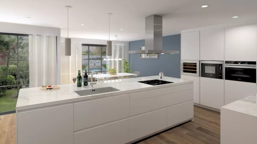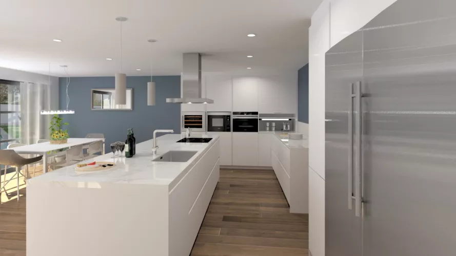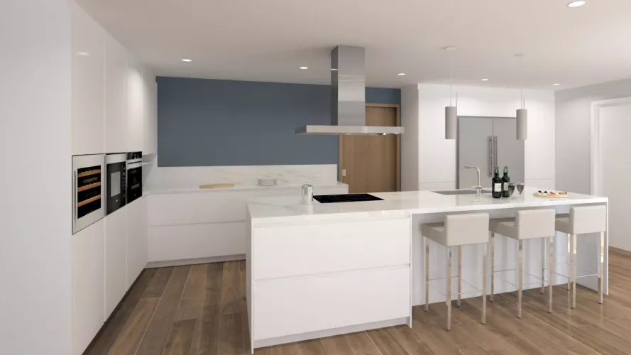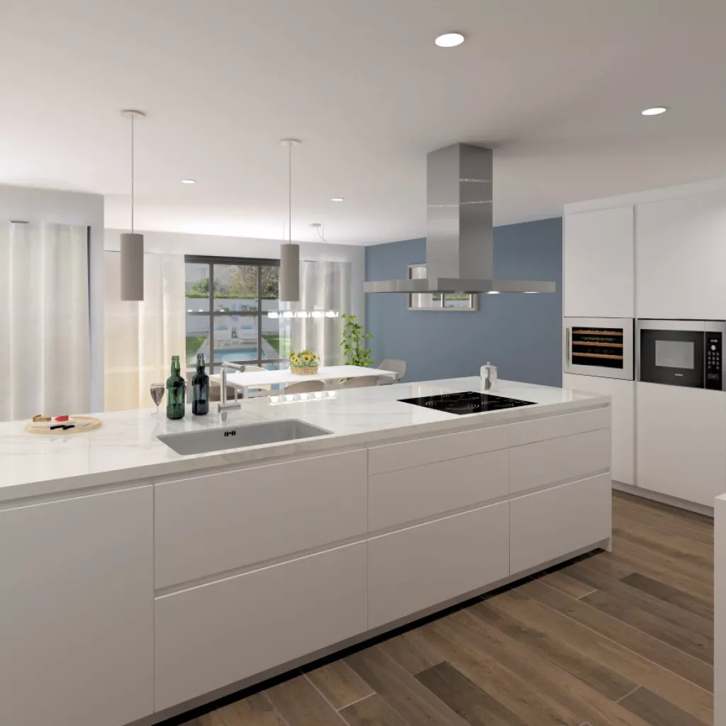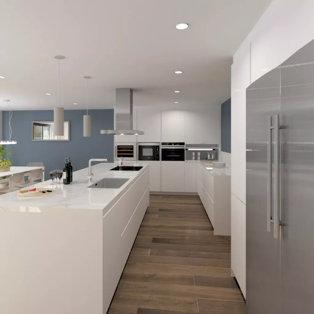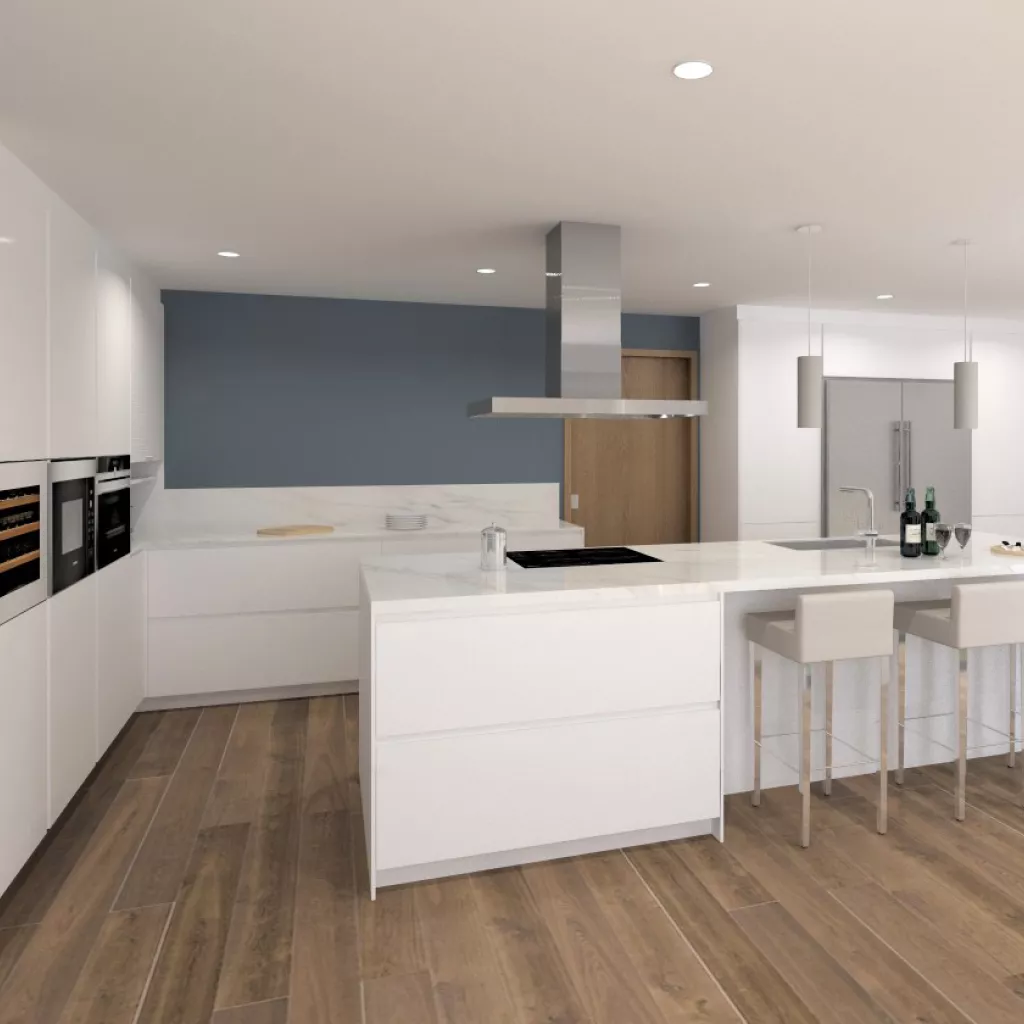 Una forma de aumentar la luminosidad y el tamaño de nuestra cocina es la aplicación del color blanco en frentes lisos y volúmenes exactos. Las cocinas Santos como ésta, realizada en Line Estratificado Blanco Innsbruk, siempre añaden equilibrio, estilo y encanto en la estancia en la que se encuentran, al ser un de un tono totalmente atemporal. El punto de ruptura ante la frialdad del blanco es su encimera Neolith Calacatta, así como su tarima en imitación a la madera. Destaca su enorme isla central que se convierte en el eje principal del conjunto, a la vez que transforma a la cocina en un espacio de lo más práctico y funcional. Los materiales utilizados en este proyecto son: LINE ESTRATIFICADO BLANCO INNSBRUK ENCIMERA NEOLITH CALACATTA