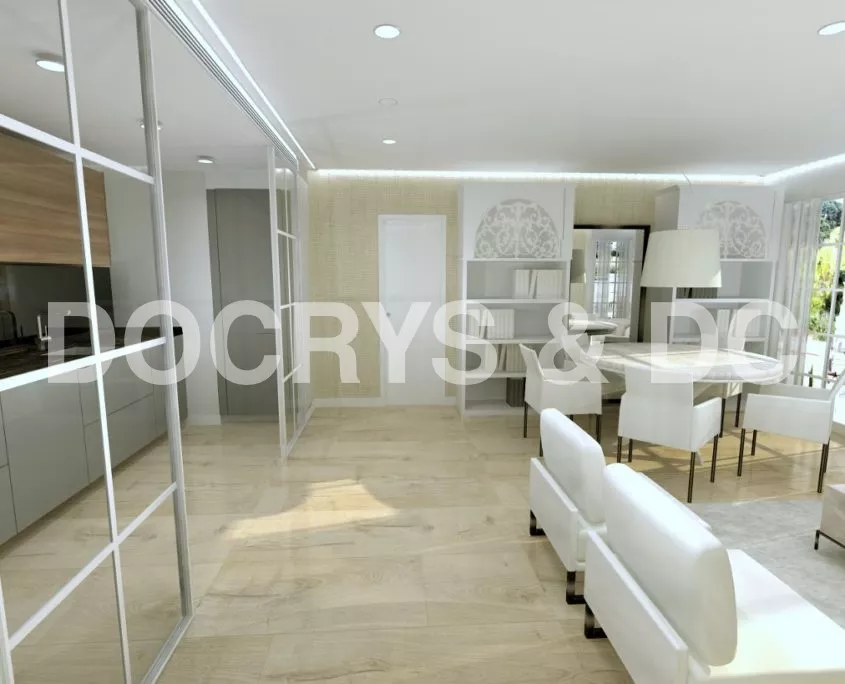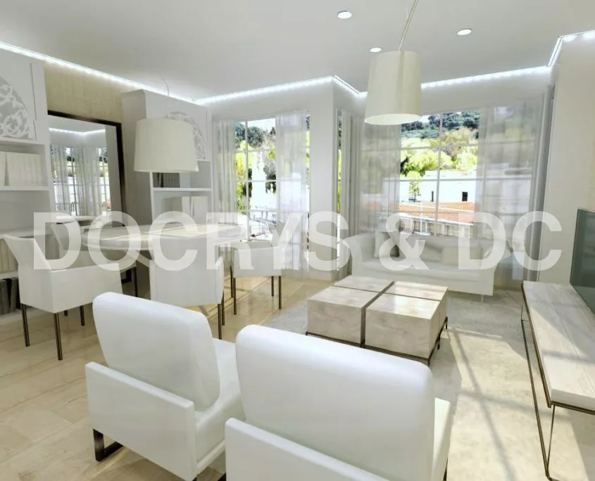 El espacio acoge diversos elementos que combinan a la perfección gracias a las tonalidades claras de las mismas. Entre ellos destacamos un sofá en blanco crudo, dos butacas, un textil beige, así como una zona comedor con mesa redondeada en mármol y sillas a juego.