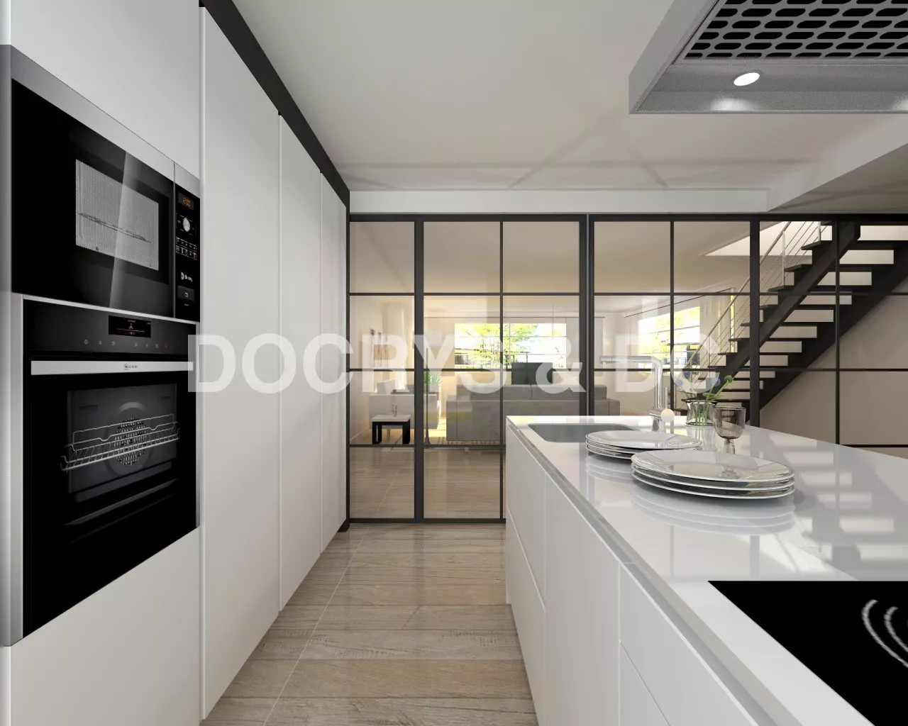 El blanco impecable dota a la cocina Santos de su característico aire de elegancia y belleza. El suelo posee un tono marrón claro, que aporta calidez y un suave contraste al resto de materiales.