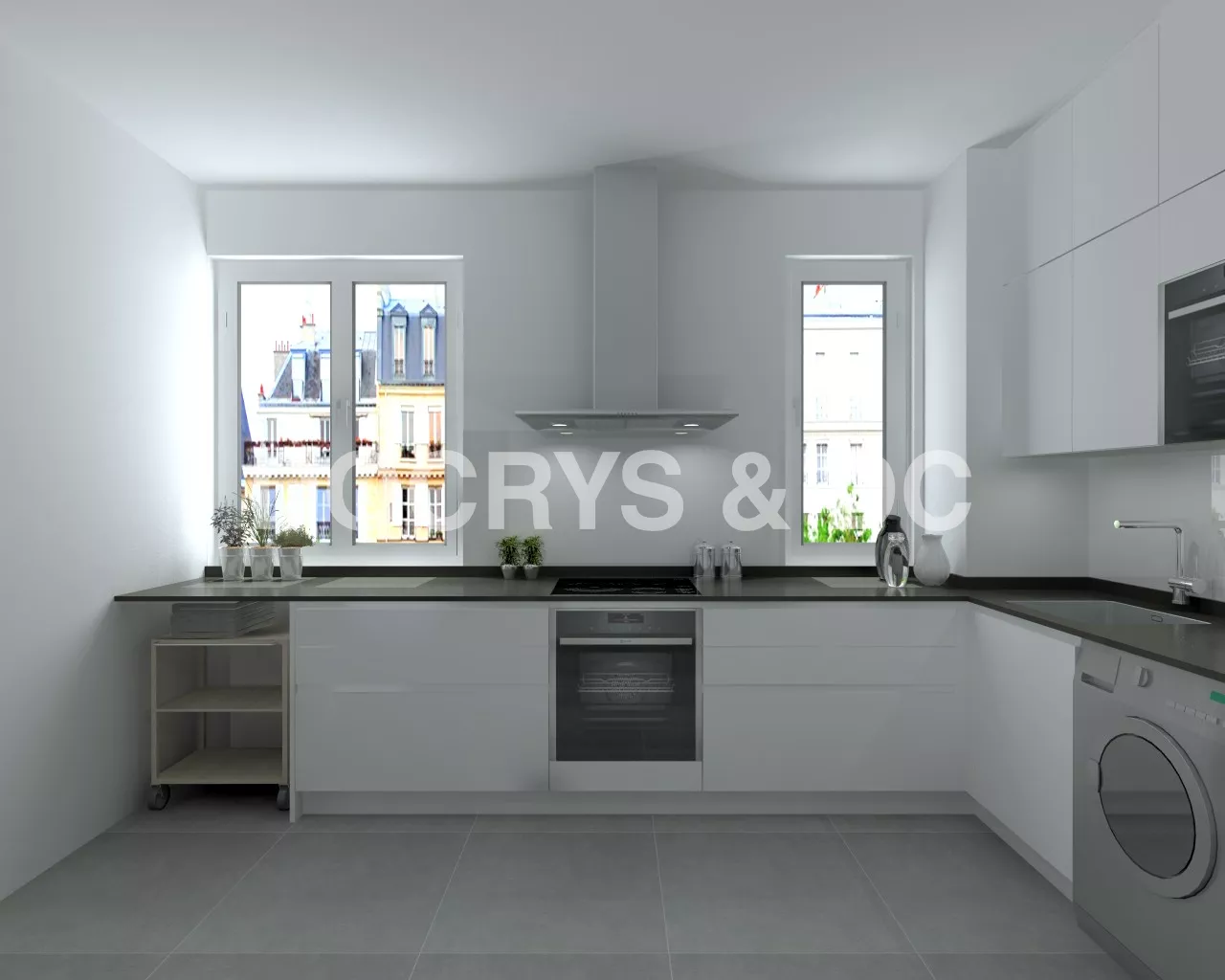 Madrid | Cocina Santos | Modelo Line L Laminado Seda Mate | Encimera Granito Sahara Night Pulido
