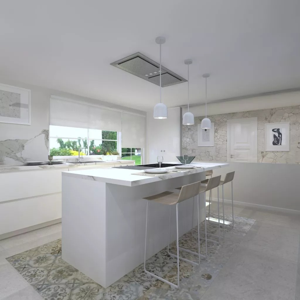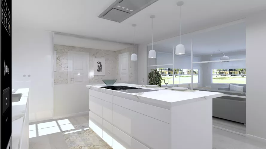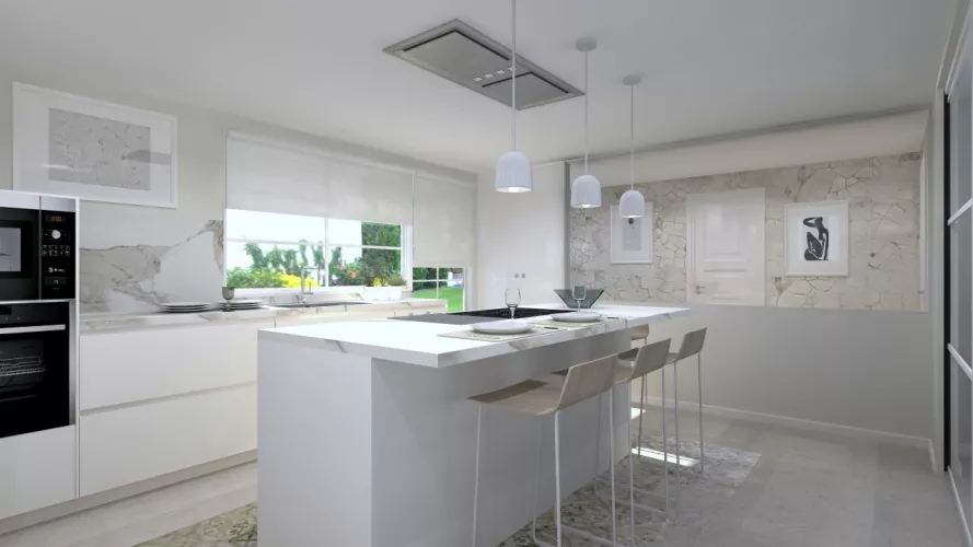 Elegancia en una cocina Santos marcada por la claridad de luz y del mobiliario realizado en el modelo Line Estratificado Blanco Innbruk y encimera Neolith Calacatta. Su isla con barra se encuentra enmarcada por un sofisticado suelo hidráulico en tonos beige cuyo contraste genera un perfecto equilibrio y armonía con el conjunto. La combinación de las líneas rectas con sus convencionales volúmenes conforma una belleza atemporal sin igual. Las butacas aportan un aire fresco y dinámico a todo el ambiente, con un toque de calidez gracias a la madera de los asientos. Elementos de este estilo son perfectos para conformar espacios confortables donde pasar agradables momentos con familia y amigos, que es la finalidad de cualquier renovación que quieras hacer en tu cocina. Los materiales Santos utilizados en este cocina son los siguientes: LINE ESTRATIFICADO BLANCO INNSBRUK ENCIMERA NEOLITH CALACATTA