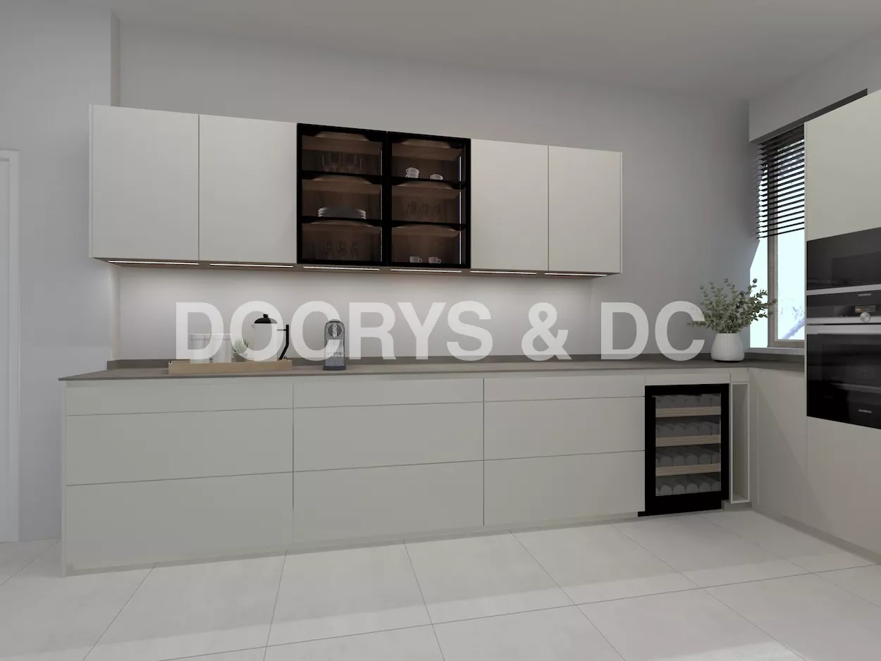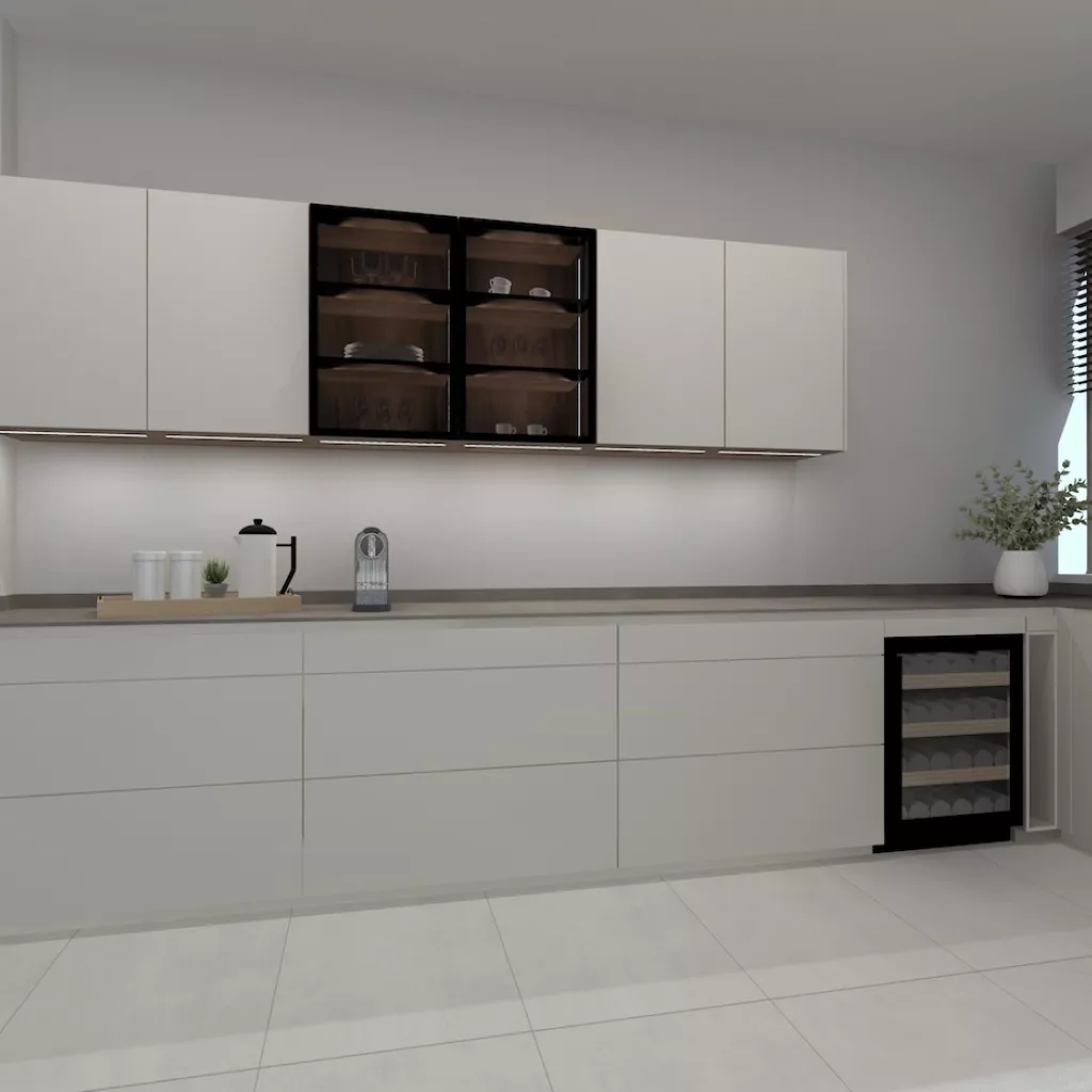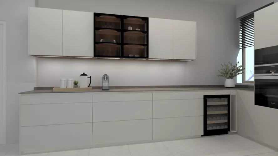 Color: BAJOS, COLUMNAS Y ALTOS: 122 PERLA BLANCO, VITRINAS: NOIR CON MARCO ALUMINIO NEGRO Y CRISTAL FUMÉ, CASCO 074 LIGHT GREY, CASCO ALTOS: 140 NOGAL TIERRA V, CASCO VITRINAS: 140 NOGAL TIERRA V