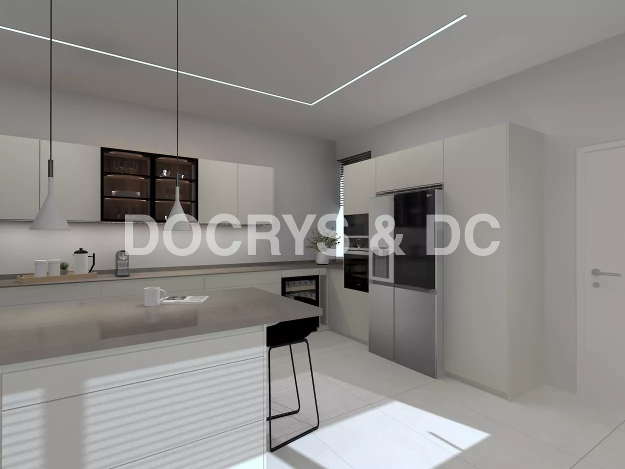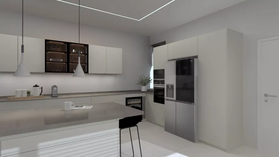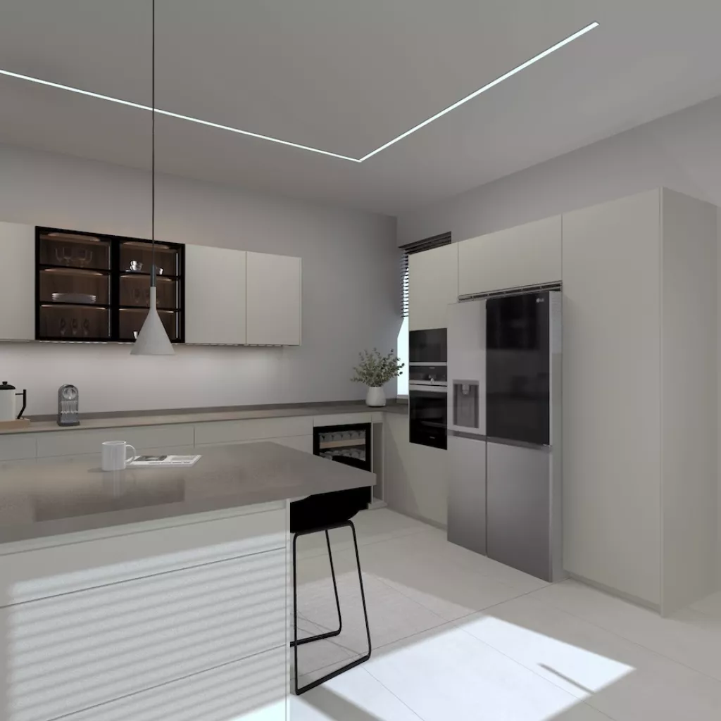 En cuanto a la iluminación observamos led integrado en el techo en color neutro y tres lámparas de colgar sobre la isla para una iluminación más focalizada.