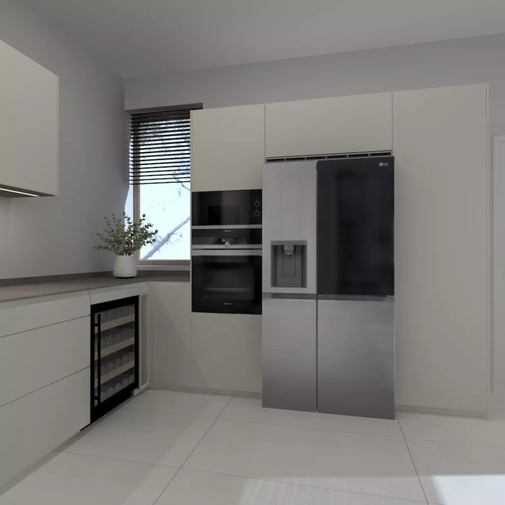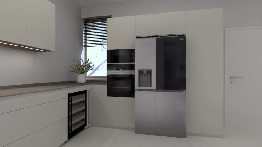A la izquierda, en el primer frente, encontramos almacenamiento en bajos y alto en color blanco perla, si continuamos podemos ver la vinoteca, seguido de microondas, horno y frigorífico americano, todo bien integrado en la cocina evitando los tiradores también en los electrodomésticos.