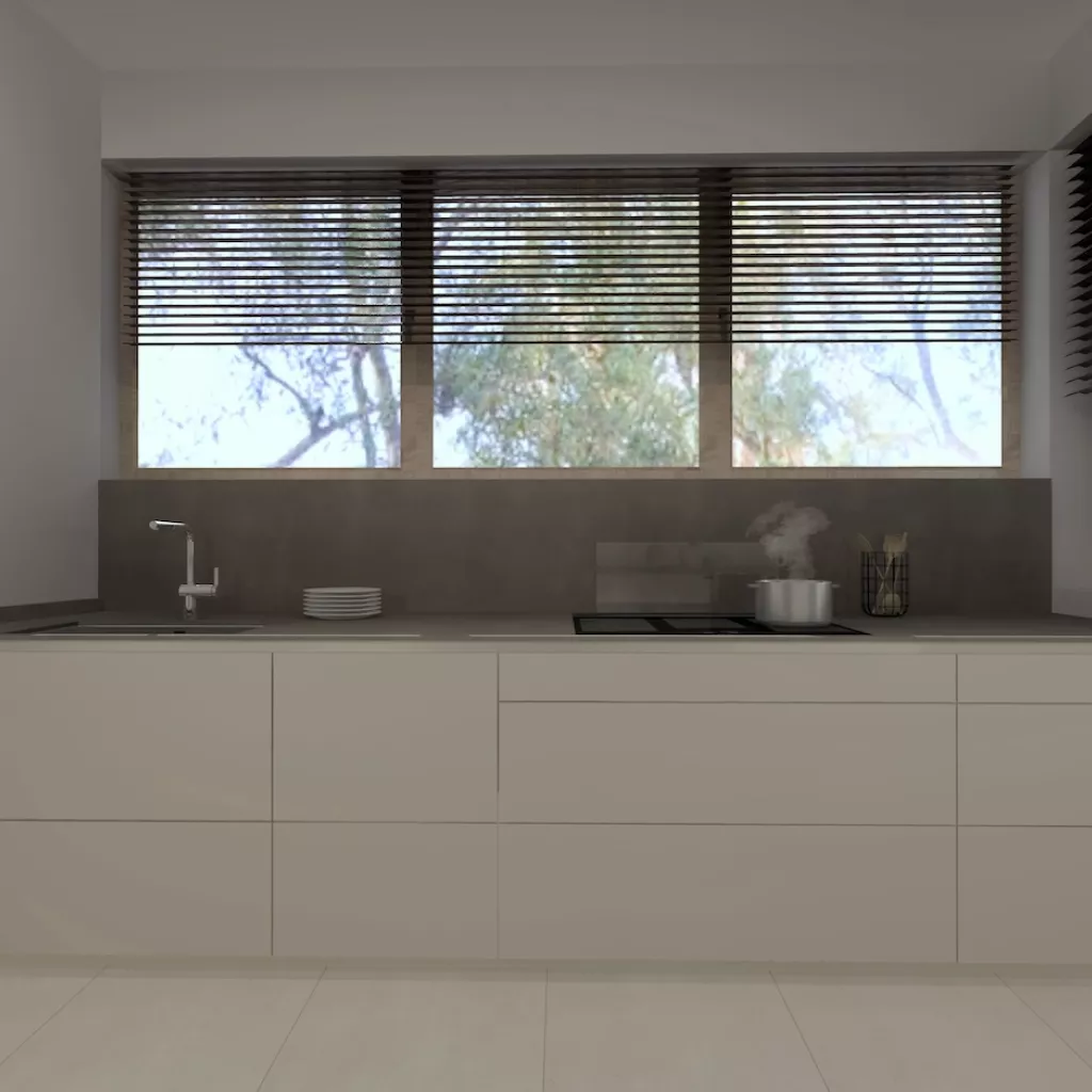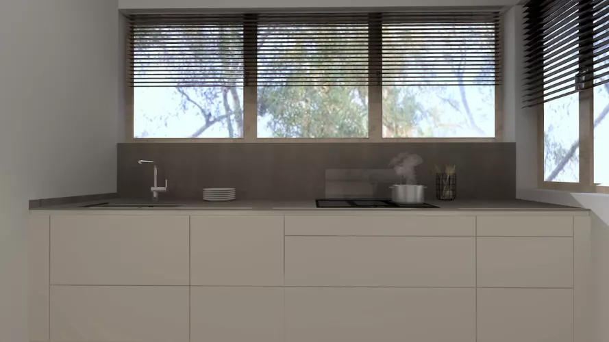 En el frente de la derecha es donde podemos encontrar el fregadero de Veravent en cromado y la placa de inducción, para tener bien definidas todas las zonas de la cocina y poder moverse de un lado a otro con total comodidad. Así el movimiento en la cocina es lógico y no entorpece en las tareas.