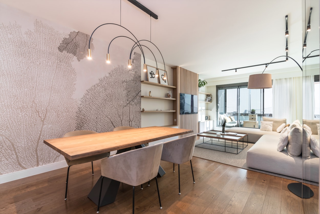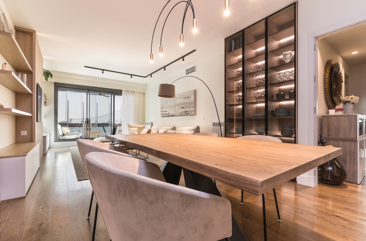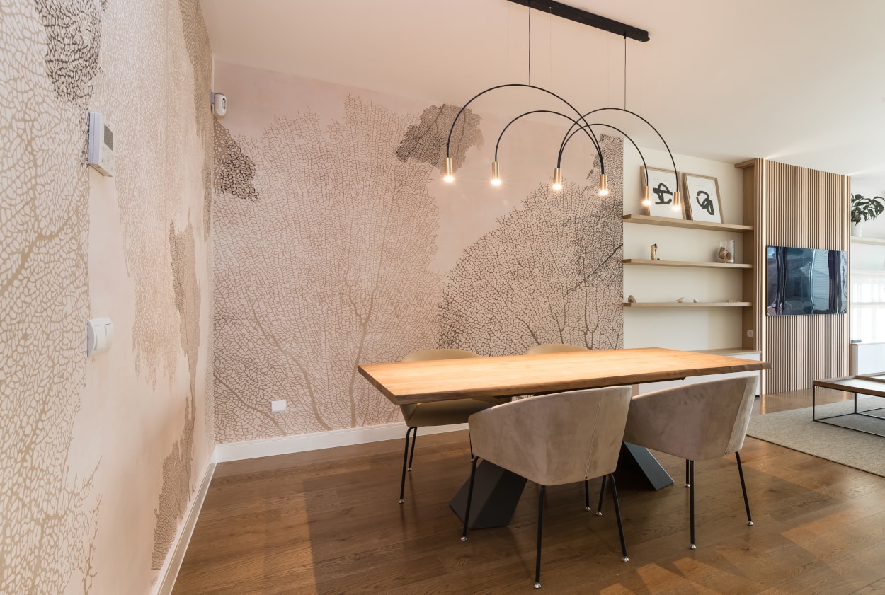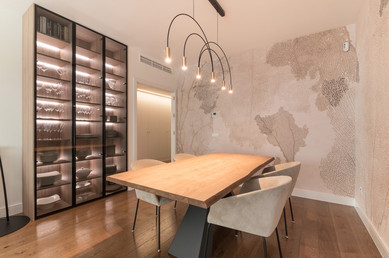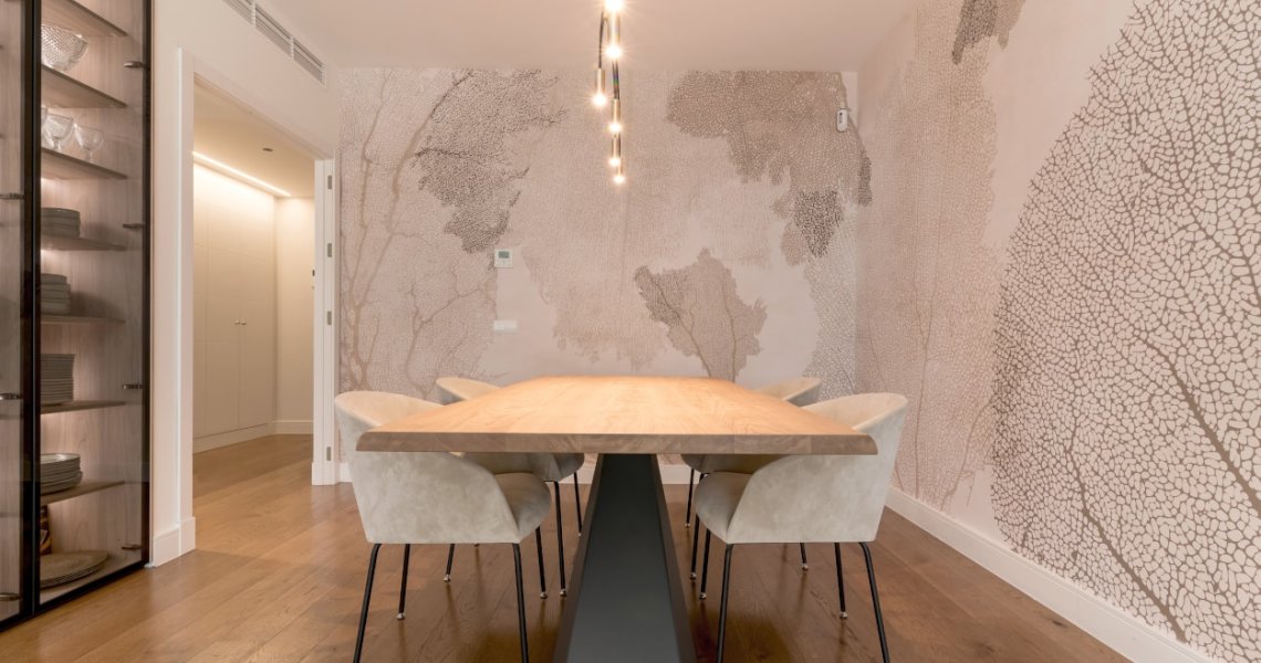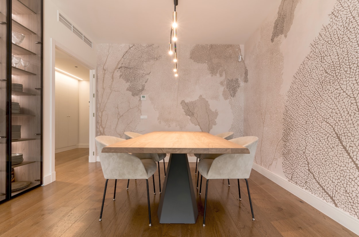 En el comedor, una espectacular mesa de Cattelan de roble natural macizo con base de metal y sillas de ante de Capdell, papel pintado de Glamora y una impactante lámpara de Estiluz, que consigue dar ese toque tan espectacular al espacio.