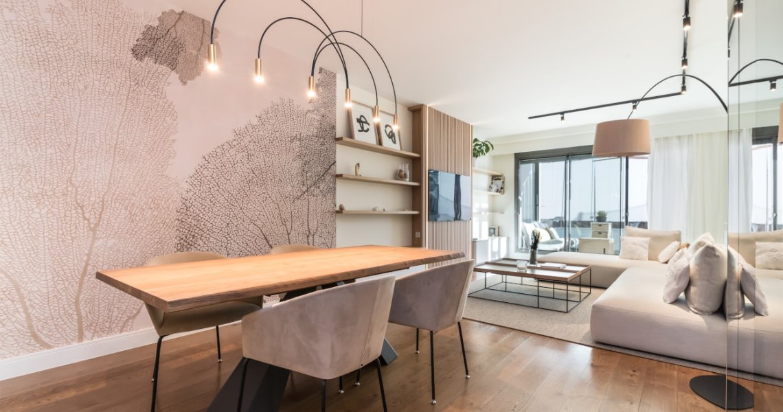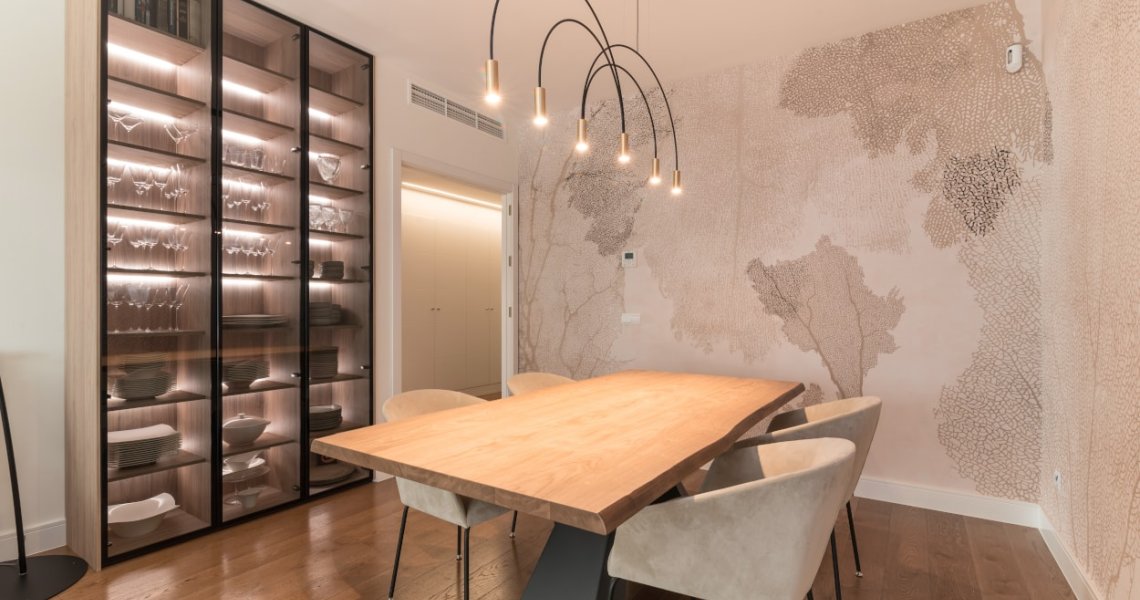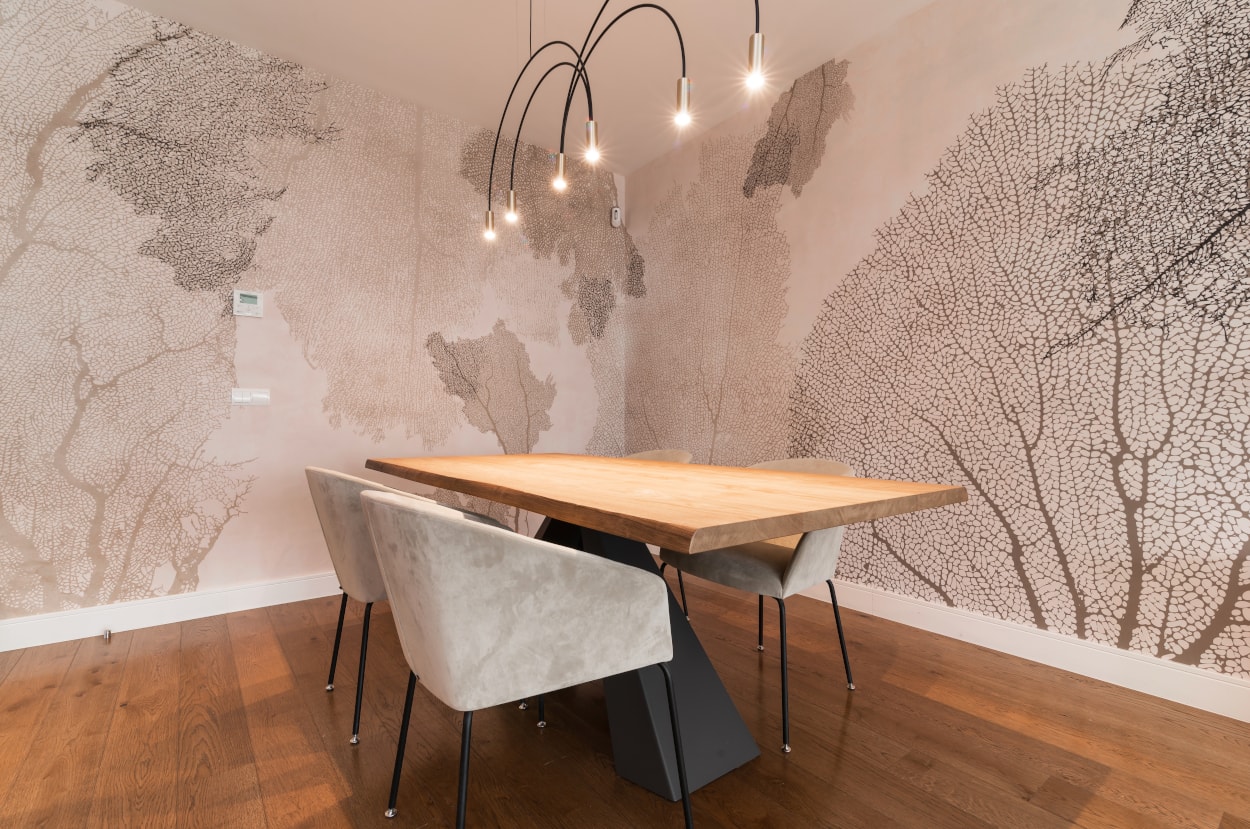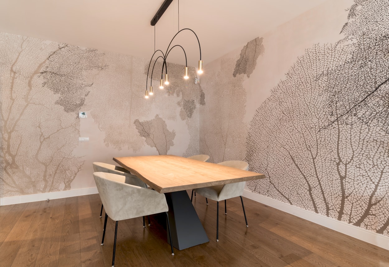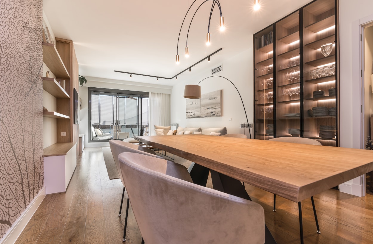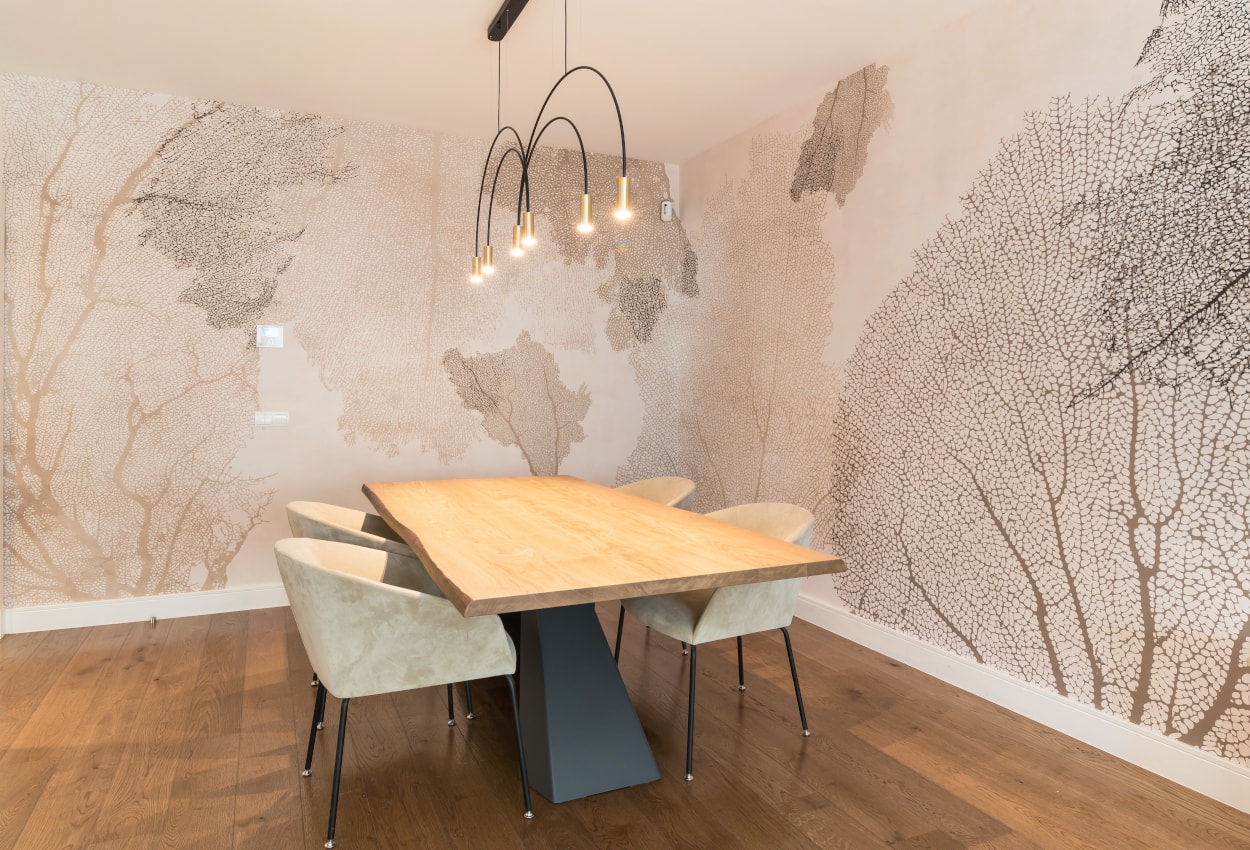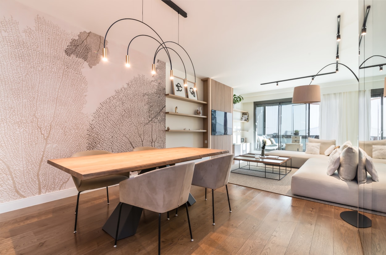 En el comedor, una espectacular mesa de Cattelan de roble natural macizo con base de metal y sillas de ante de Capdell, papel pintado de Glamora y una impactante lámpara de Estiluz, que consigue dar ese toque tan espectacular al espacio.