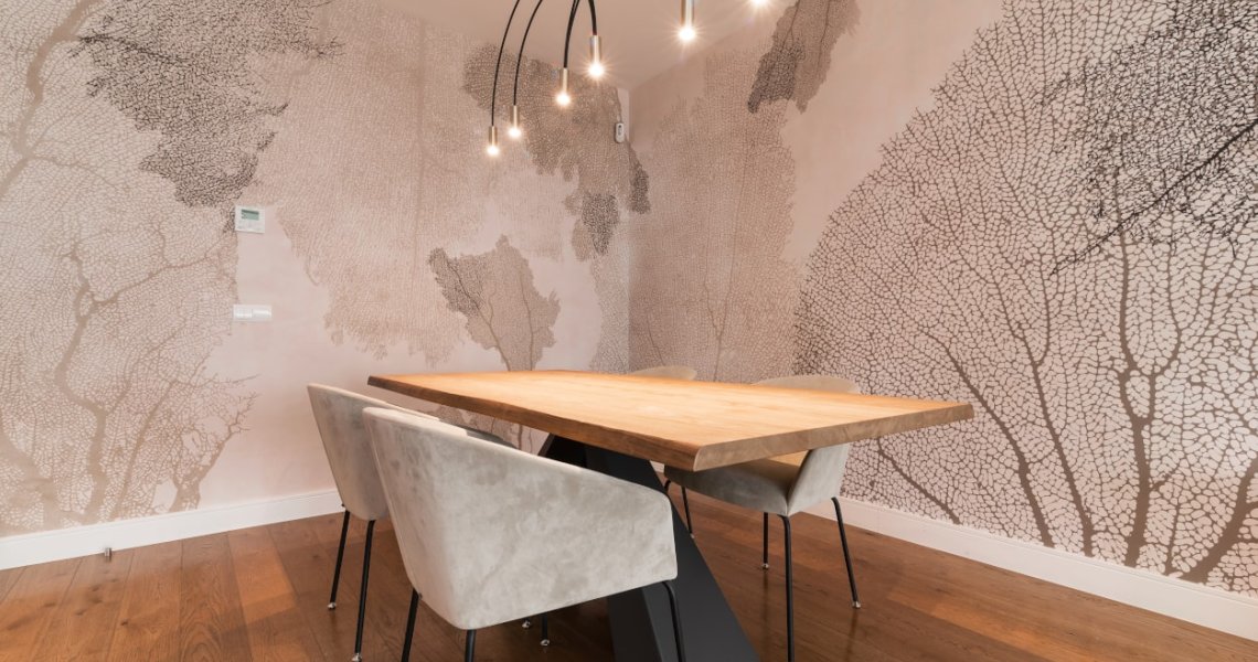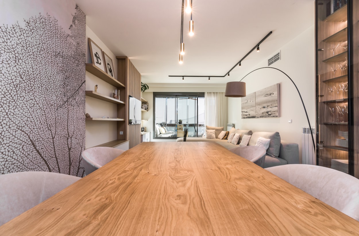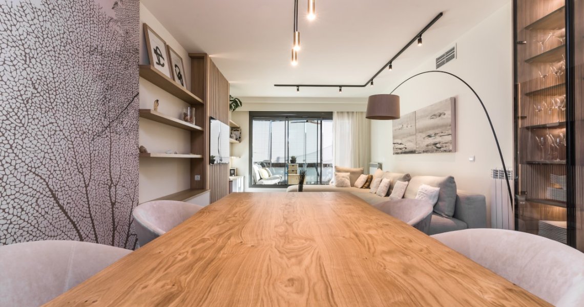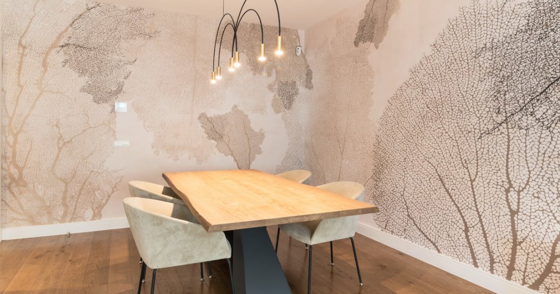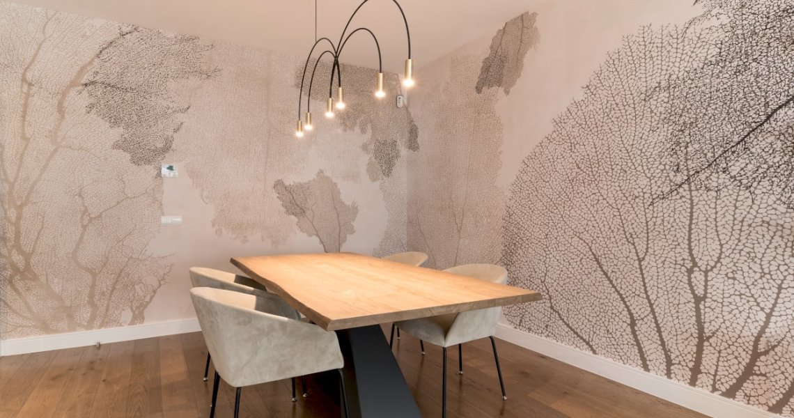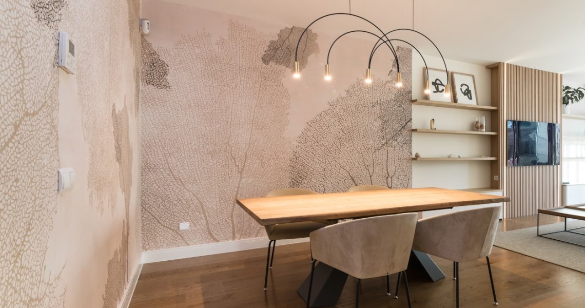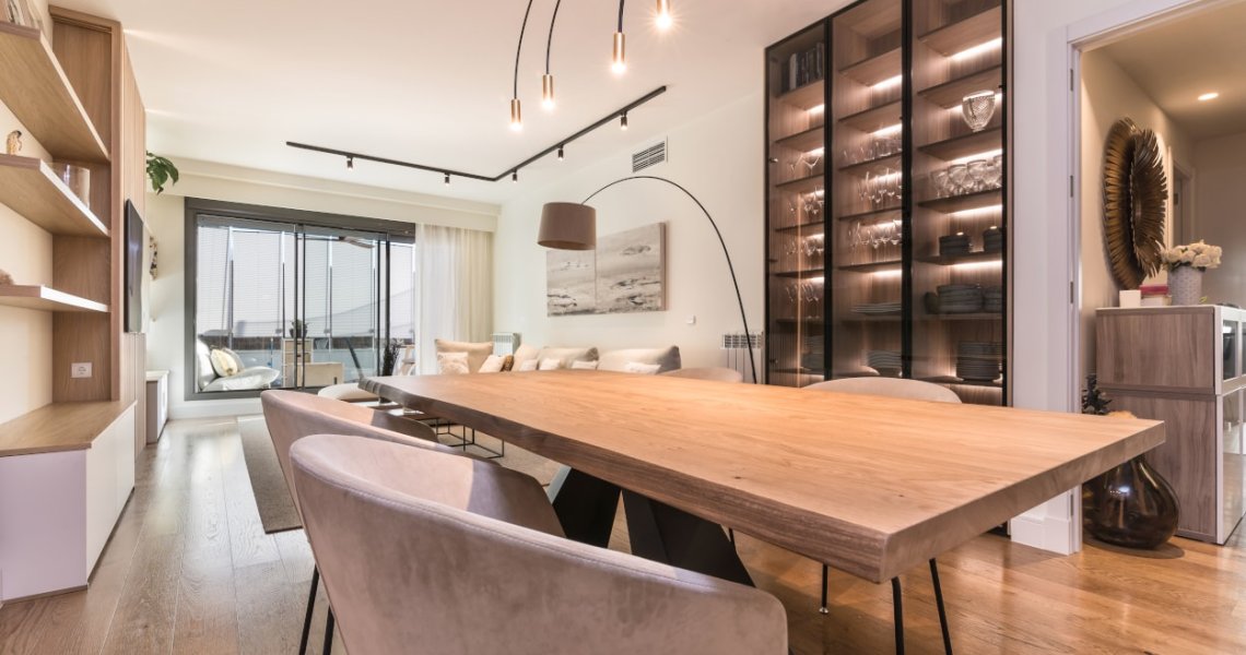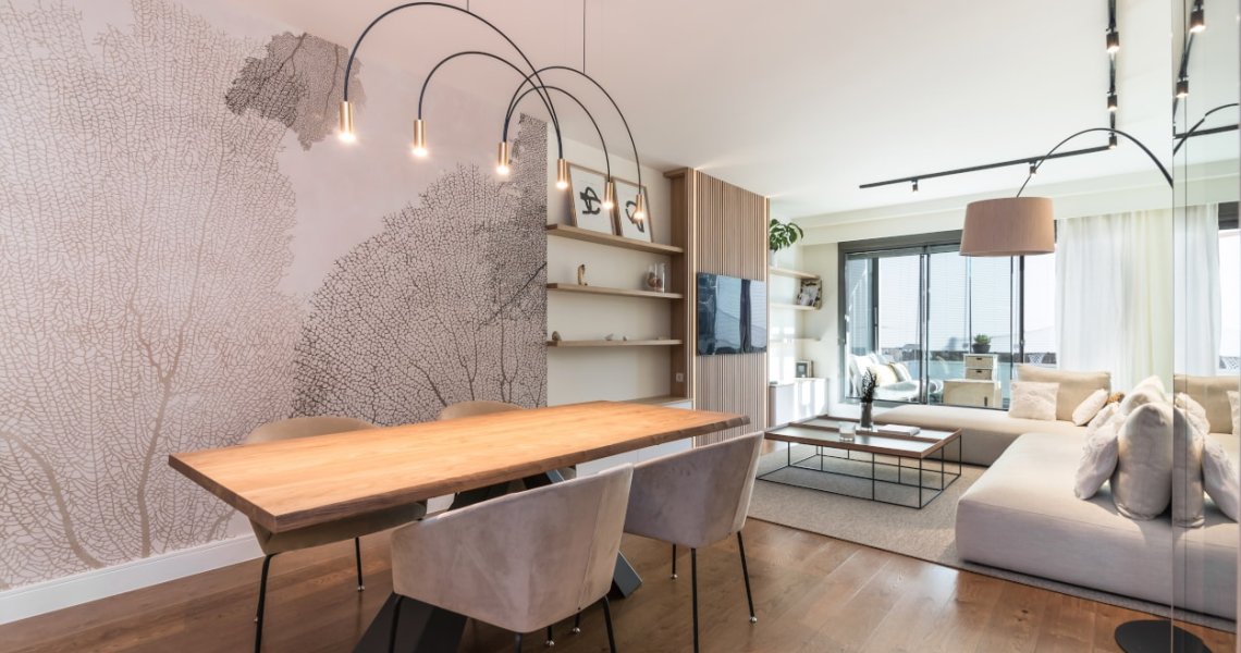 En el comedor, una espectacular mesa de Cattelan de roble natural macizo con base de metal y sillas de ante de Capdell, papel pintado de Glamora y una impactante lámpara de Estiluz, que consigue dar ese toque tan espectacular al espacio.