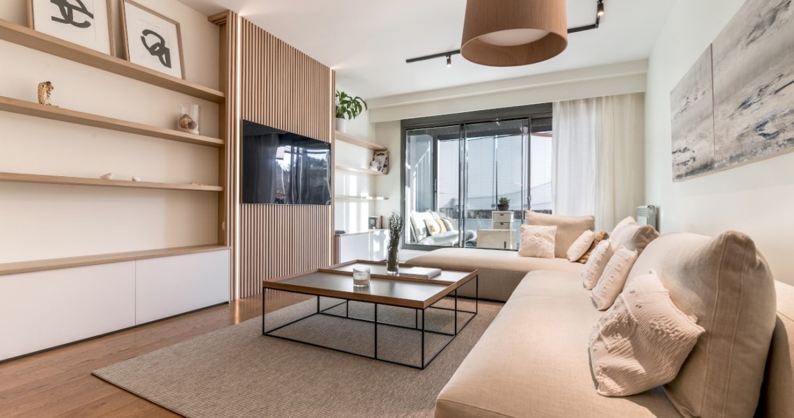 La televisión reposa en la pared sobre una palilleria diseñada en exclusiva por Docrys & DC y a los lados, muebles bajos de Santos.