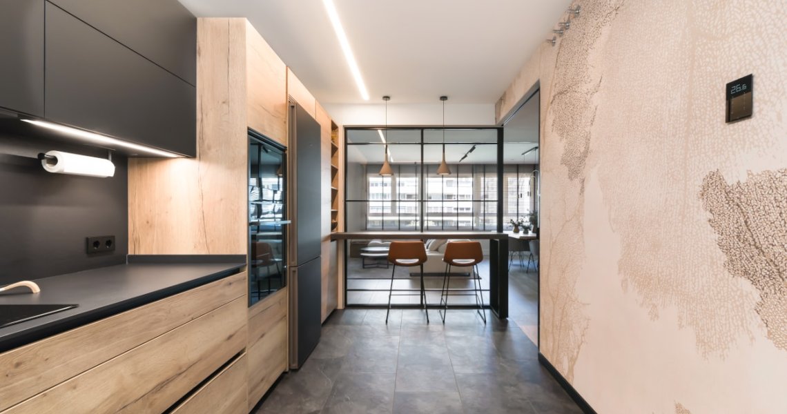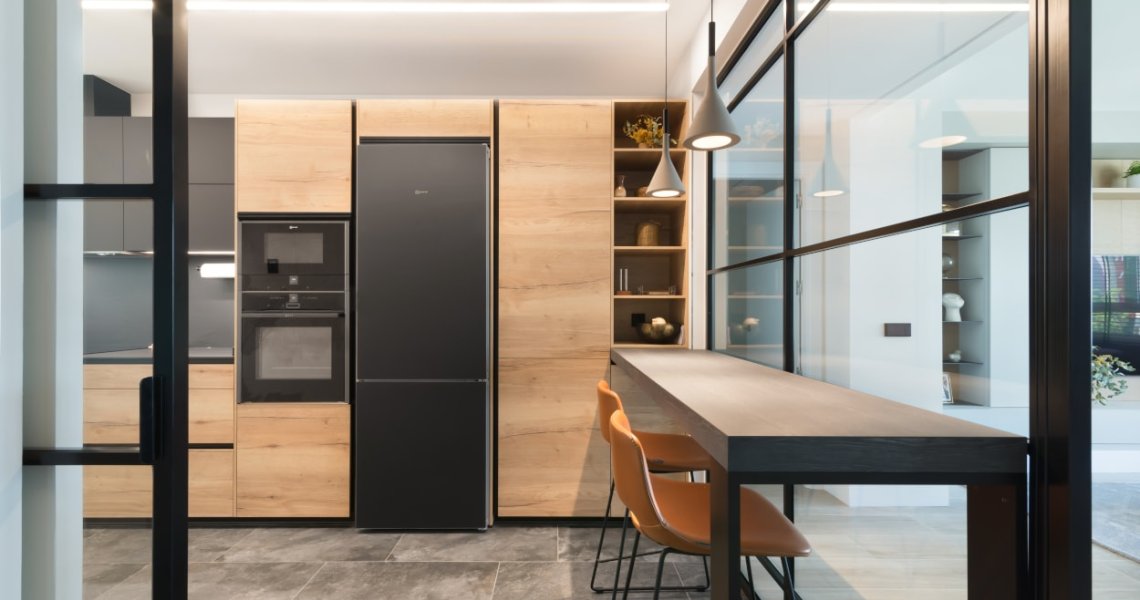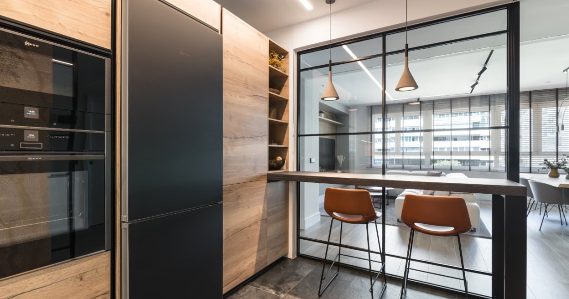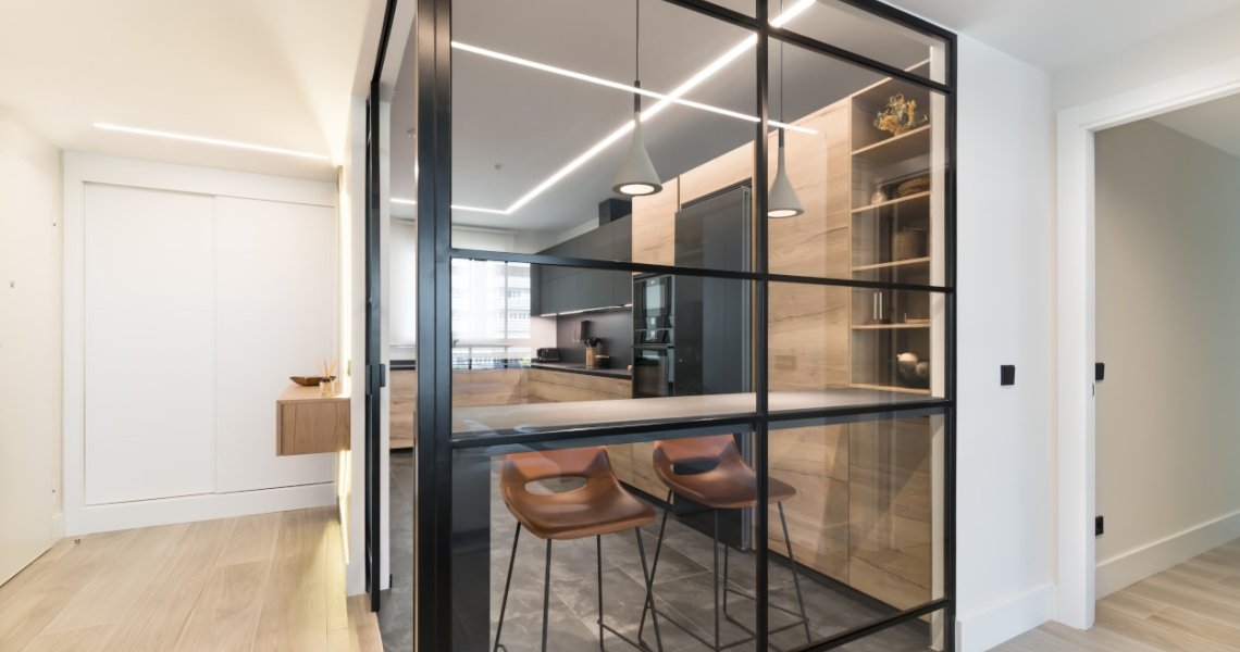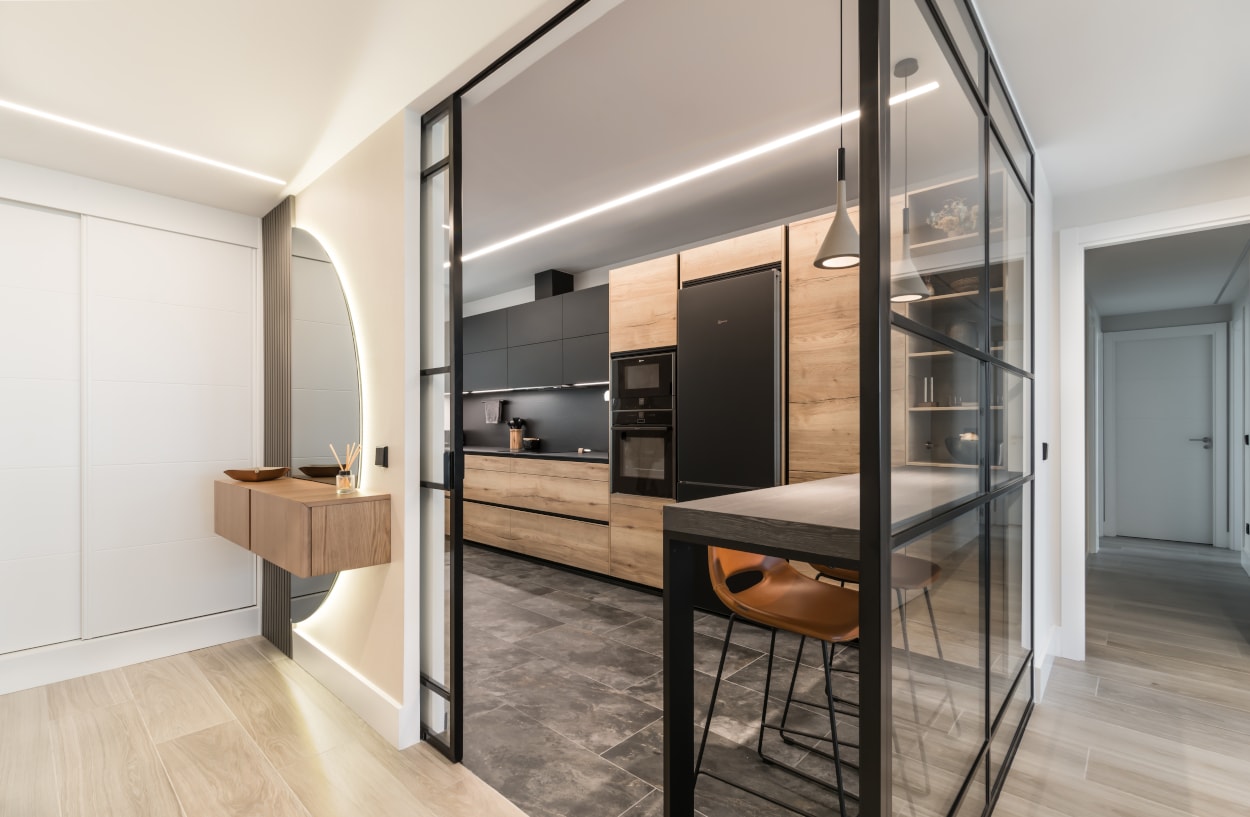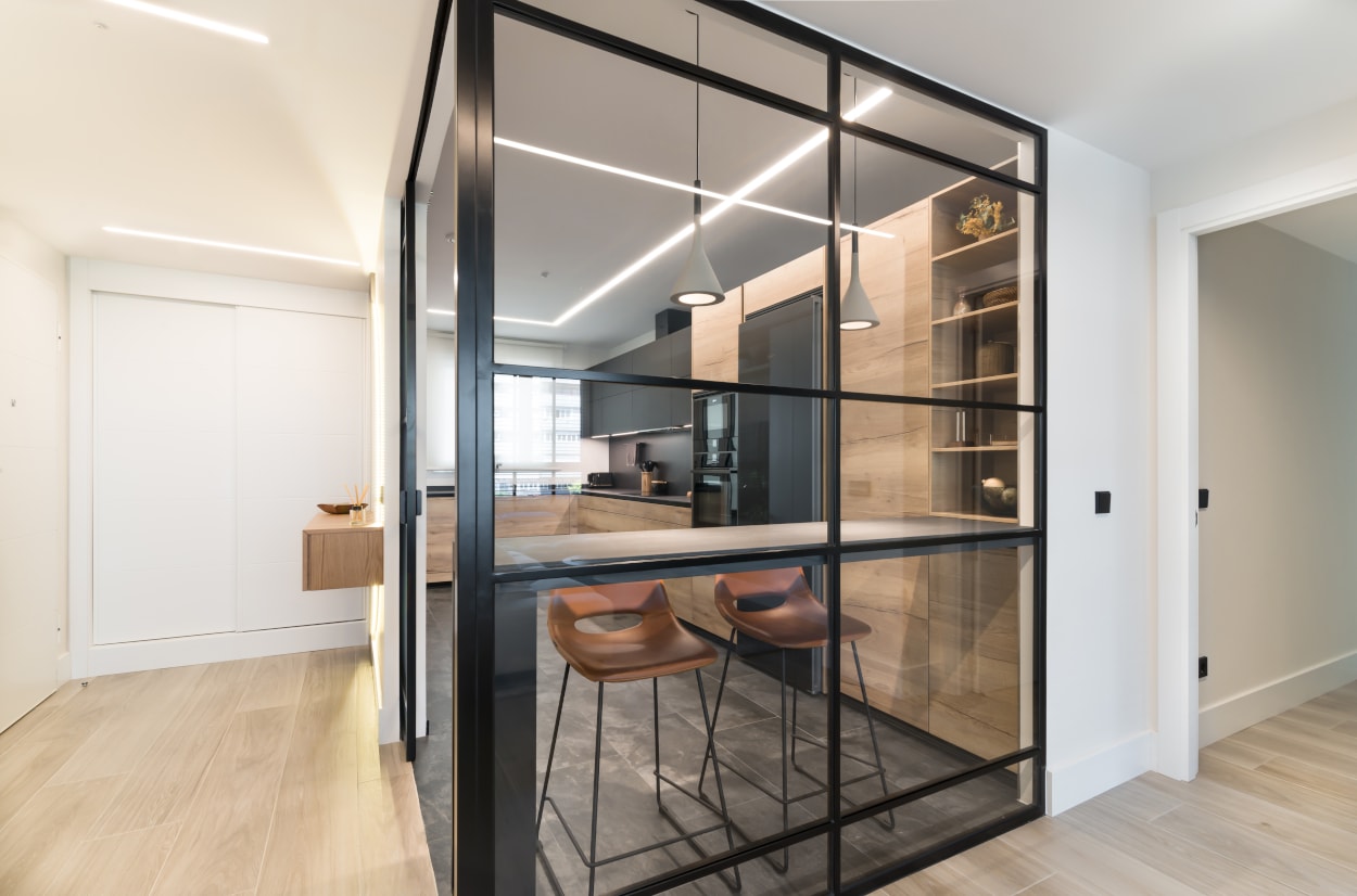 En primer lugar, decidimos abrir la cocina al salón, creando un espacio semiabierto pero siempre conectado a través de unas puertas correderas de cristal y aluminio negro.