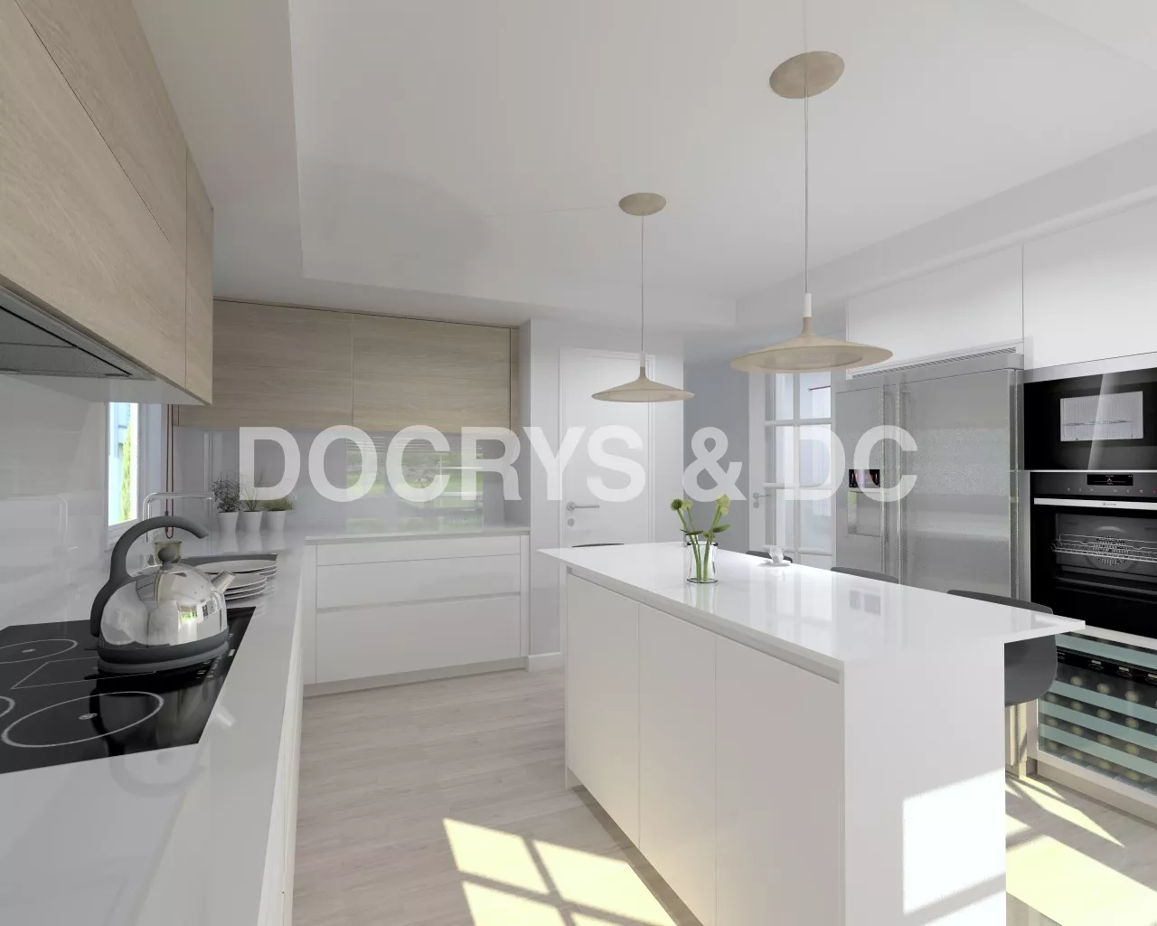 Se trata de una cocina de diseño unifamiliar, en la que se busca reflejar la pureza y simplicidad de sus muebles. Los elementos imprescindibles como el horno, el microondas y la vinoteca, se adaptan a la sencillez pretendida, ya que se acoplan de una manera discreta y sin ocupar espacio, permitiendo disponer de una amplia superficie para moverse dentro de la estancia.