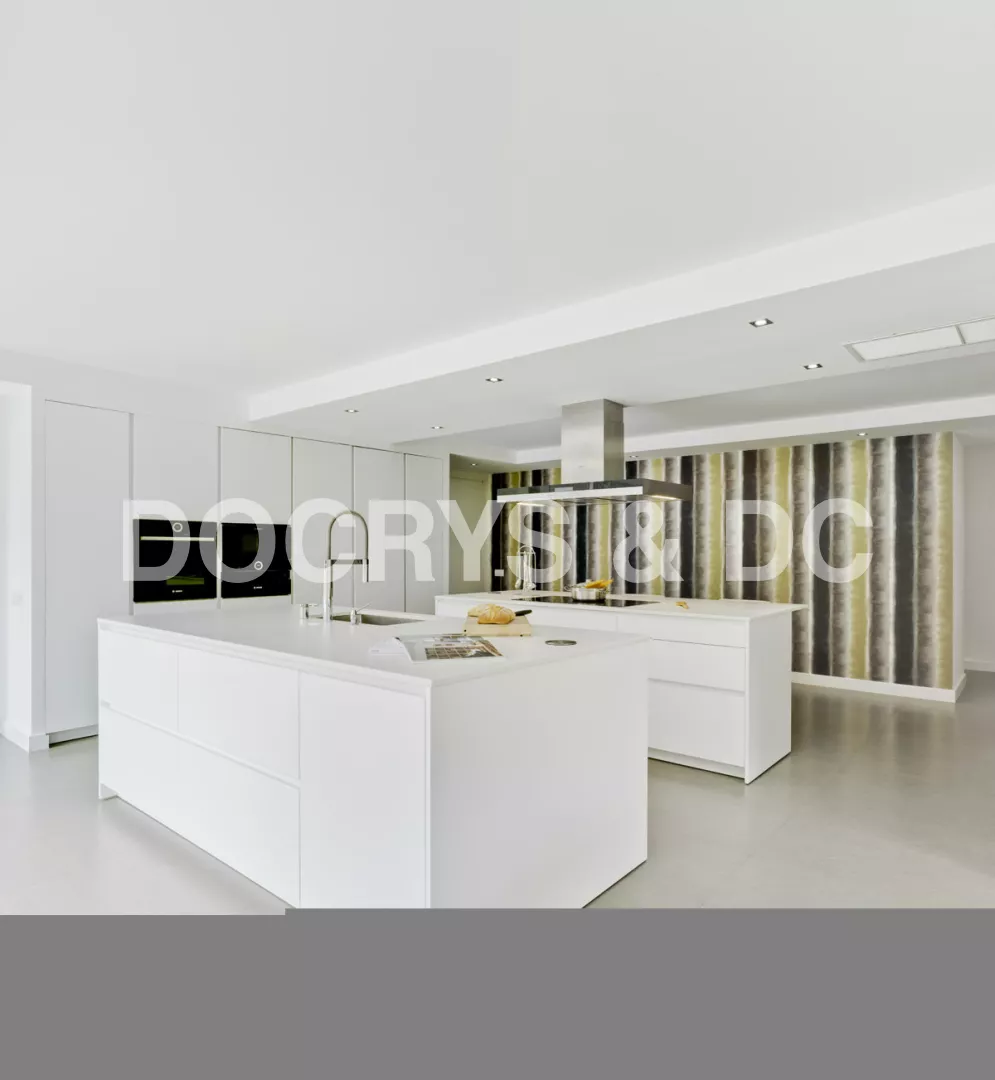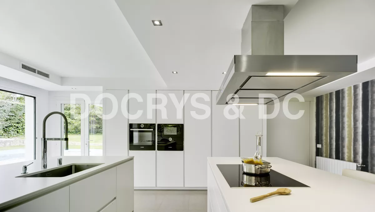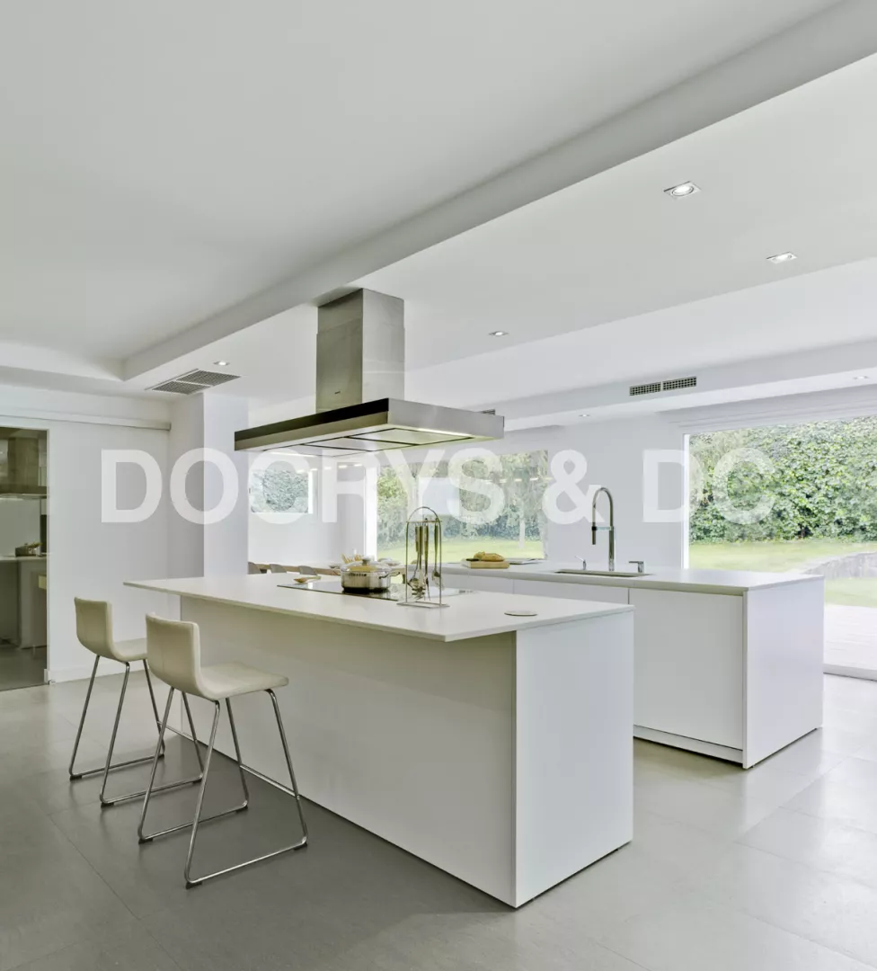 En los espacios amplios y luminosos una solución estética y multifuncional es la integración de dos grandes islas centrales que dividen la zona de aguas y cocción con esta Cocina santos.