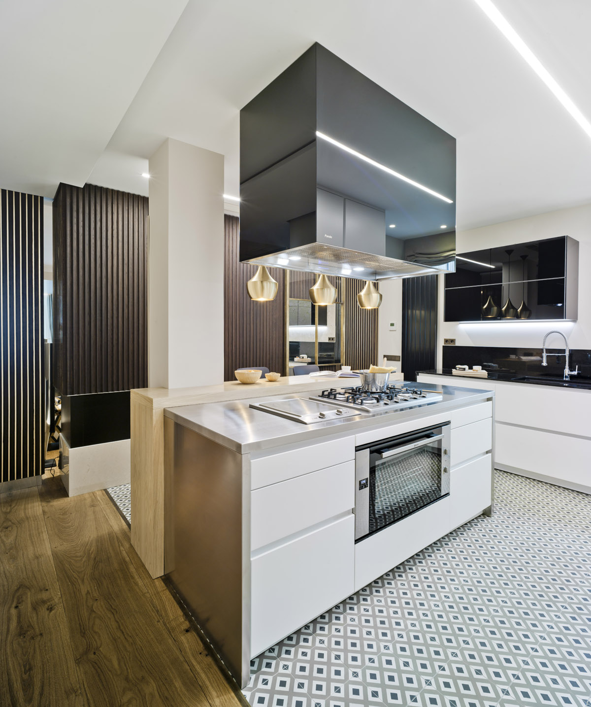 El corazón de la misma es sin duda, su gran isla central en acero que dispone de una zona de cocción, una zona de trabajo, una llamativa campana decorativa en cristal negro y una barra en roble ideal para los desayunos en familia. Además del diseño de esta cocina que es el corazón de la vivienda, el resto de las estancias que conforman la vivienda también fueron diseñadas por la arquitecta Julia Bajo y la interiorista Mónica del Campo siguiendo un estilo elegante y contemporáneo.