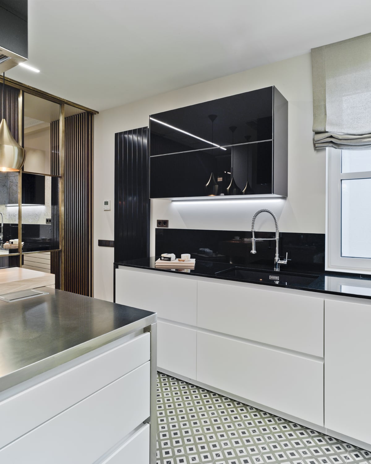 Para su distribución en forma de L se ha optado por un mobiliario lacado correspondiente al modelo Line Blanco Seda Mate de Santos, encimera Granito Negro intenso y Acero Satinado para su isla. Combina módulos altos, bajos y columnas con el objetivo de ofrecer la máxima funcionalidad y almacenaje. La pureza del mueble, sus líneas rectas y formas simples convierten a esta cocina en un extraordinario diseño contemporáneo.