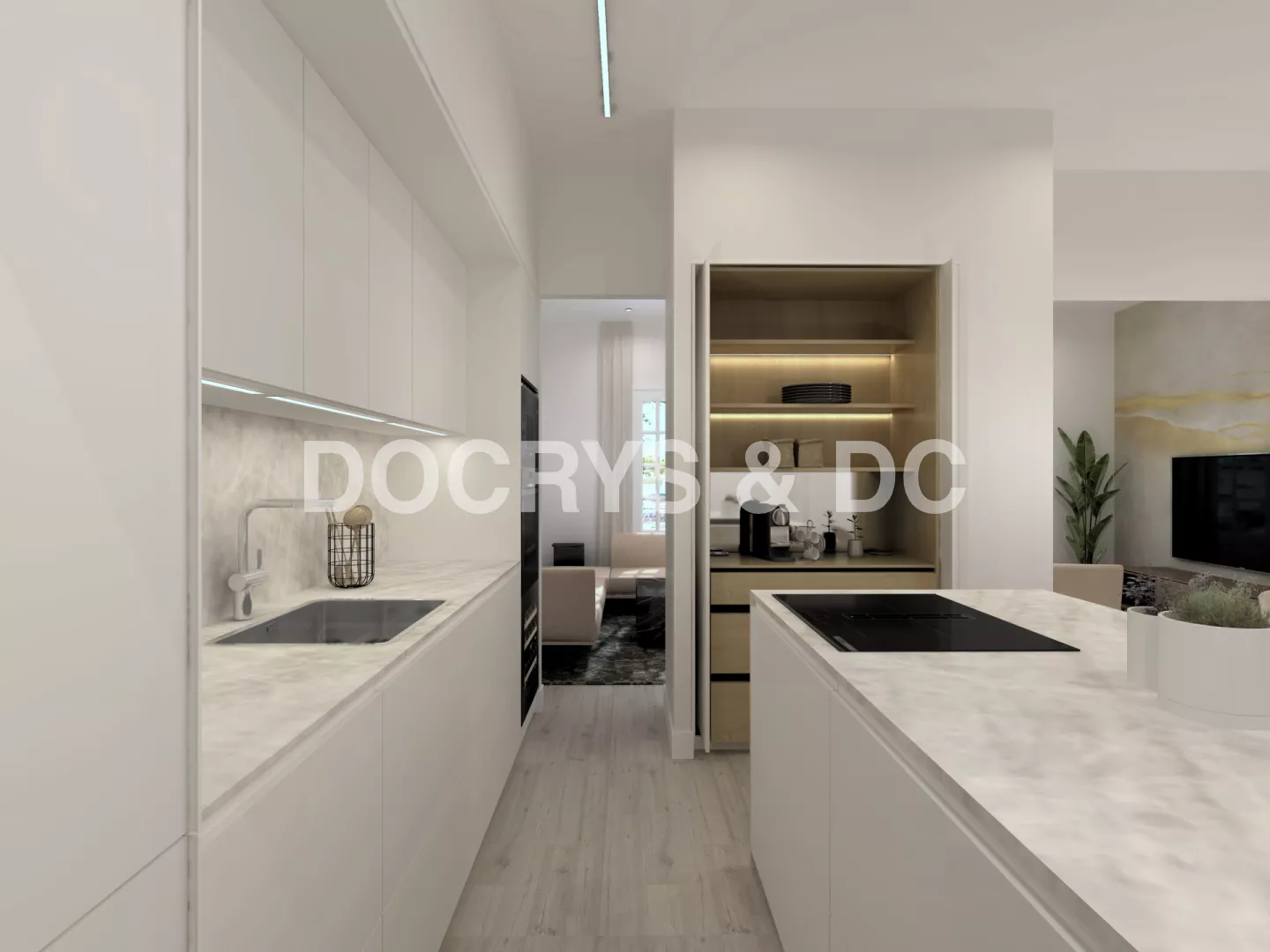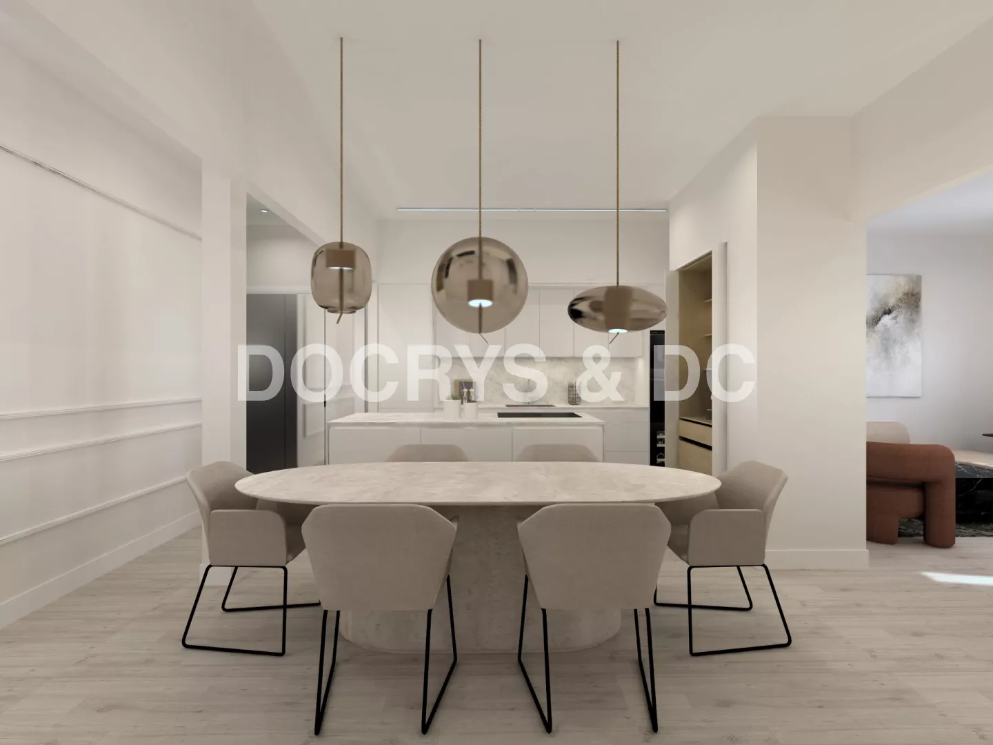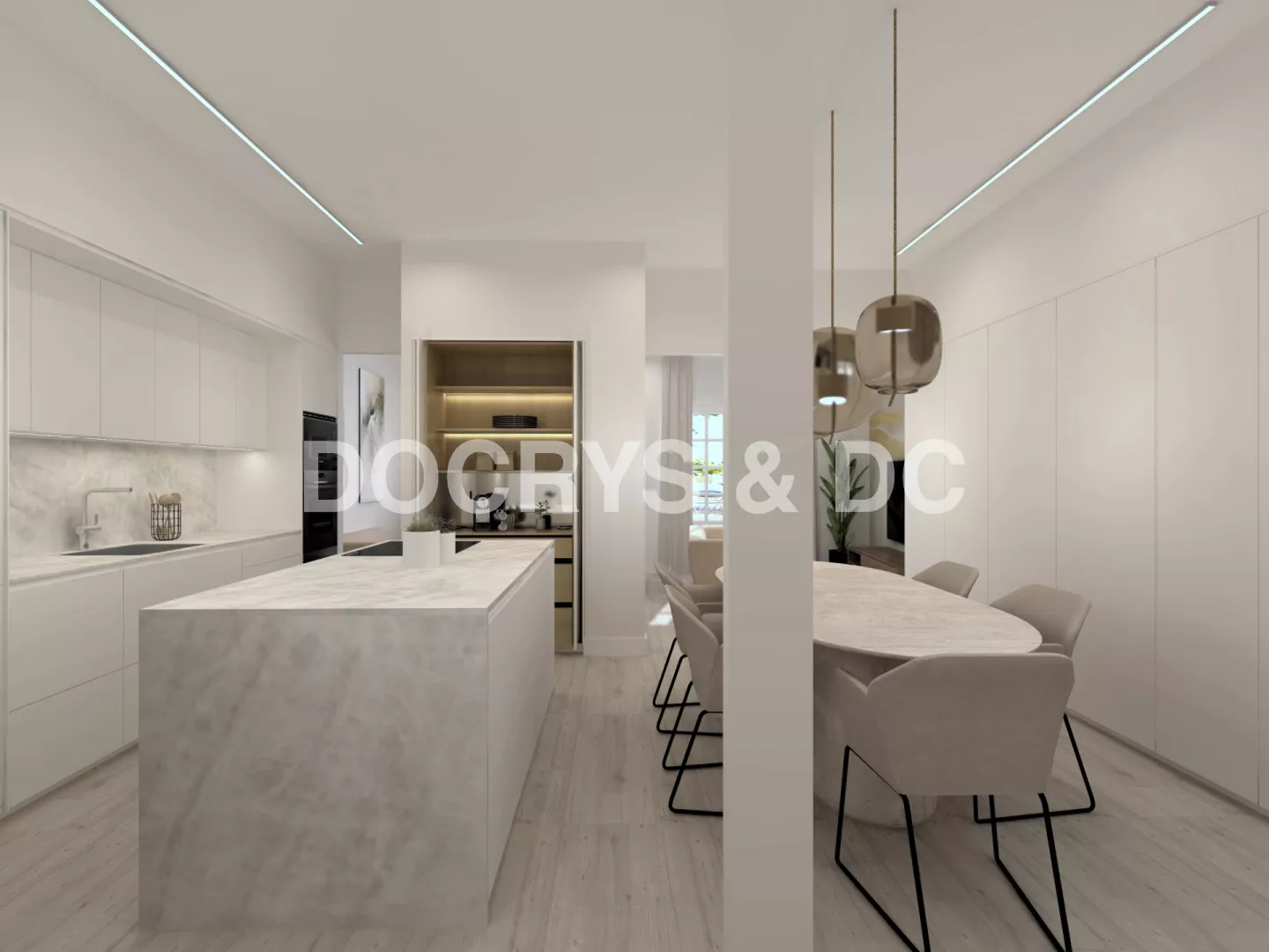La iluminación refuerza el carácter contemporáneo del proyecto. Las líneas de luz integradas en el techo y bajo los muebles altos proporcionan una iluminación homogénea, discreta y funcional, realzando los volúmenes sin interferir en la pureza visual del espacio. Las luminarias suspendidas sobre la mesa del comedor aportan un toque decorativo que completa la escena.