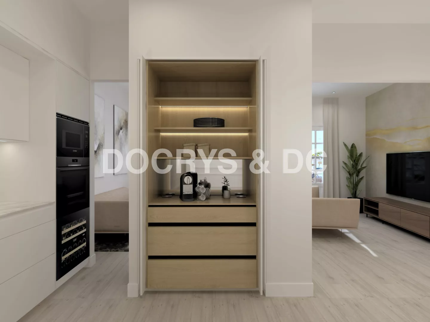 Como elemento singular, se ha incorporado un módulo de almacenaje abierto en madera natural, diseñado a medida e iluminado de forma indirecta. Este volumen actúa como pieza de transición entre la cocina y el salón, aportando profundidad, textura y un punto de calidez que equilibra la neutralidad del conjunto.