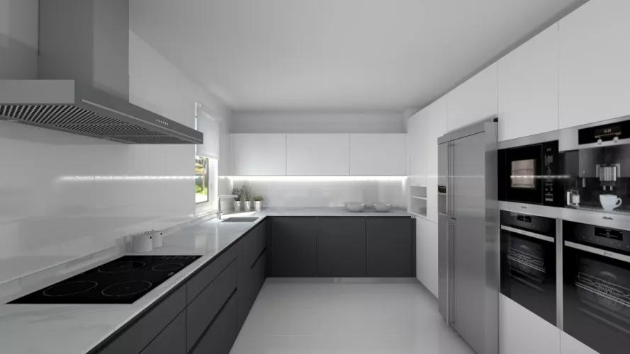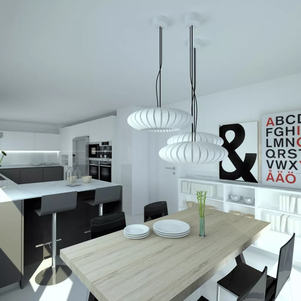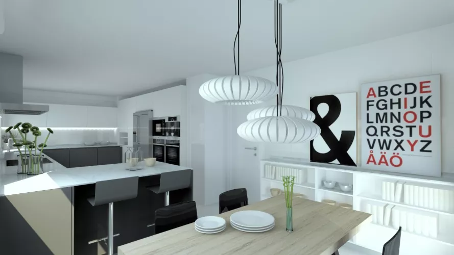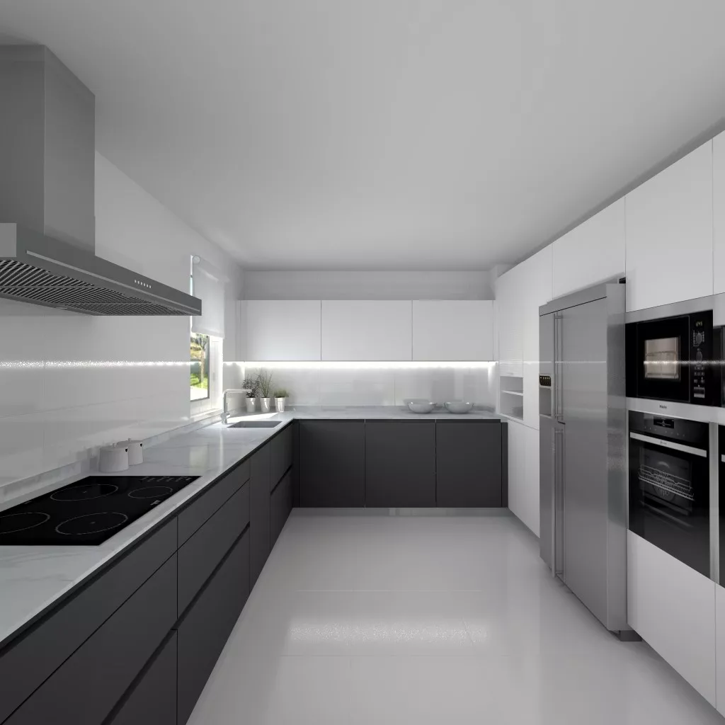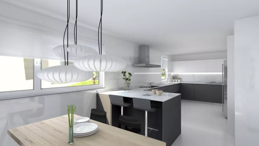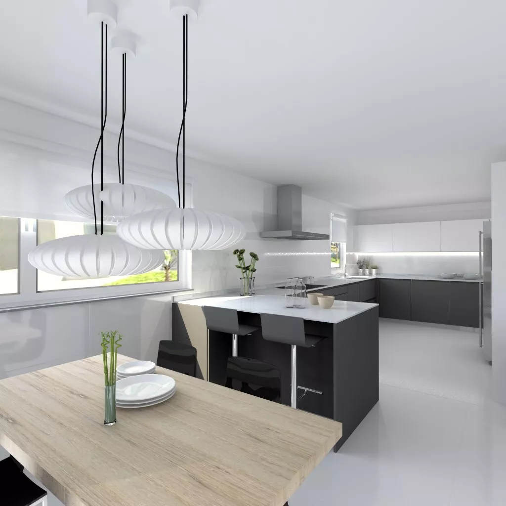 Hemos creado un espacio perfecto para realizar tareas diarias con una gran comodidad en una cocina espaciosa, perfecta para el día a día en una familia. El binomio del modelo Line Estratificado Gris Antracita con el Blanco Seff crea una estética fresca y contemporánea en esta elegante cocina Santos. Sus estructuras presentan un lenguaje sencillo y recto configurando un conjunto multifuncional compuesto por columnas de integración, muebles altos y bajos. Resulta llamativa su zona de barra y comedor donde encontramos una enorme mesa en madera que añade naturalidad y calidez en el ambiente. El toque moderno lo aportan por un lado las lámparas colagantes que bien nos recuerdan a una flor, así como los cuadros en blanco y negro apoyados sobre el mobiliario en blanco. Los materiales utilizados en esta cocina Santos: LINE ESTRATIFICADO GRIS ANTRACITA Y BLANCO SEFF. ENCIMERA NEOLITH SILK CALACCATA.