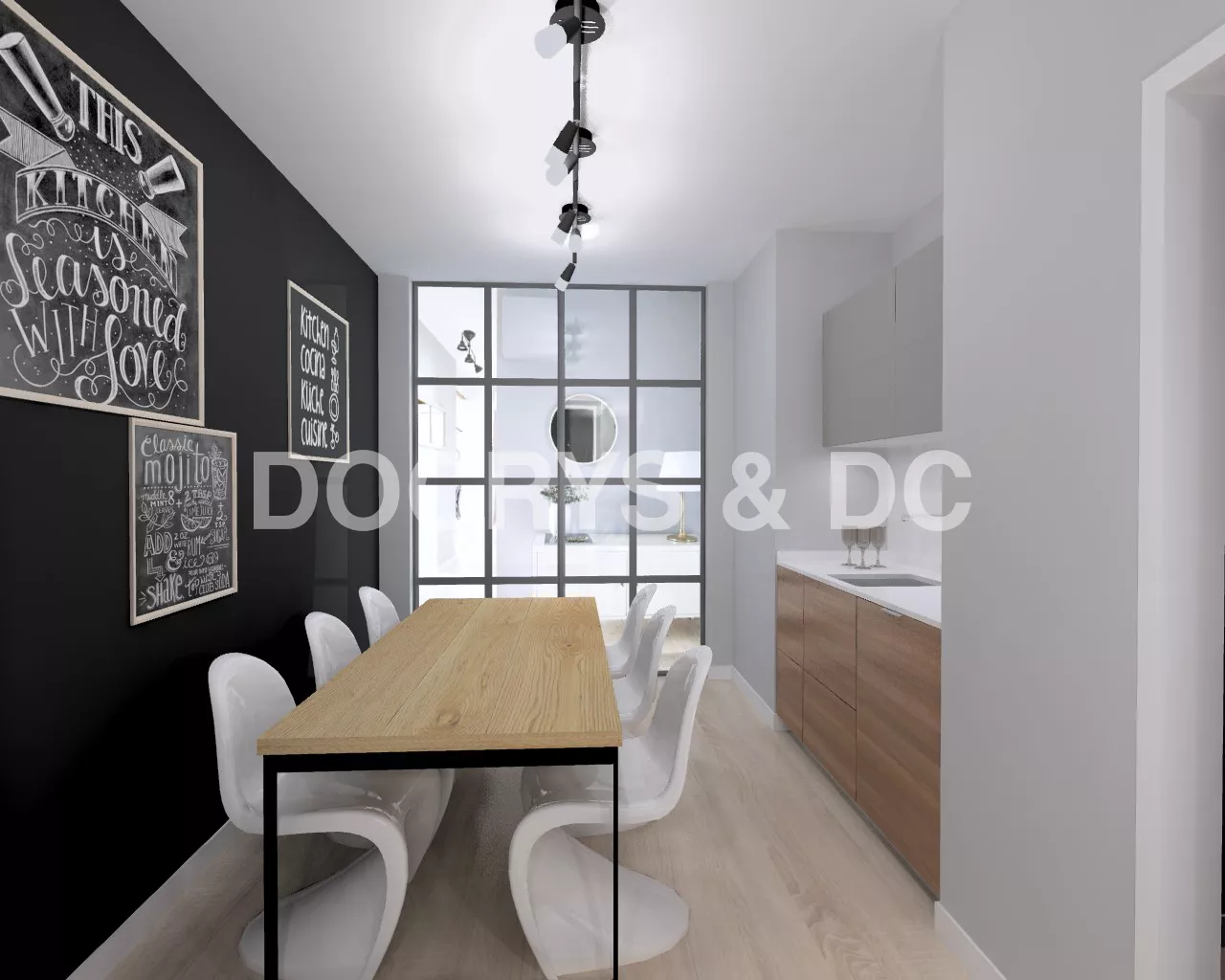 Su mayor ventaja es que alberga un amplio espacio en el que se puede ubicar una mesa de cocina con sillas. La cristalera situada al fondo, permite mantener la conexión con el resto de la vivienda, y los estantes altos y los muebles bajos aportan una gran capacidad de almacenaje, lo cual hace de esta reforma integral una apuesta acertada para cualquier familia.