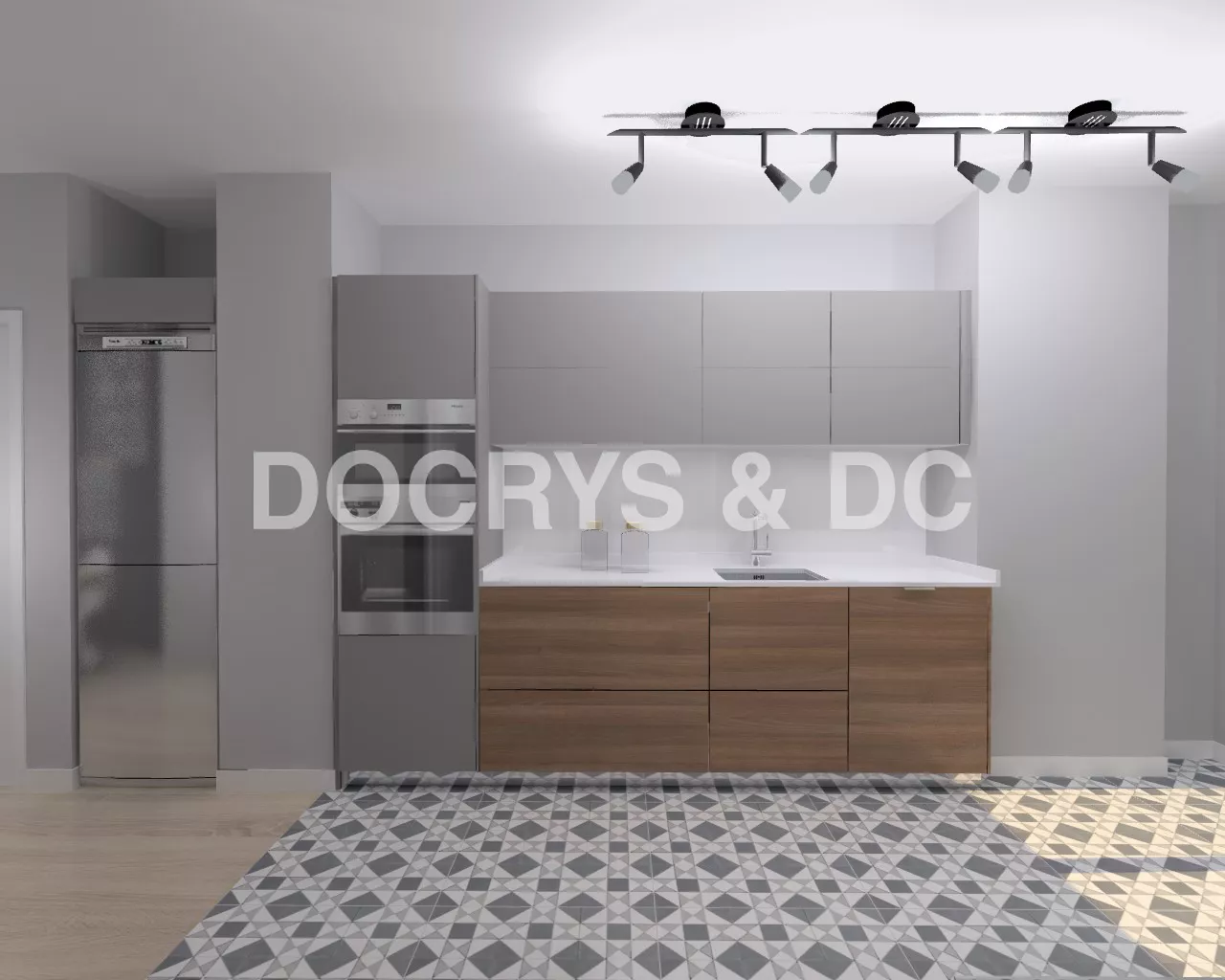 Este proyecto de cocina en el que se ha utilizado el modelo FINE-E y LINE LAH se diferencia por la combinación de colores Gris Visón y Nogal Tierra con los mosaicos hidráulicos del pavimento ofreciendo un toque único al conjunto.