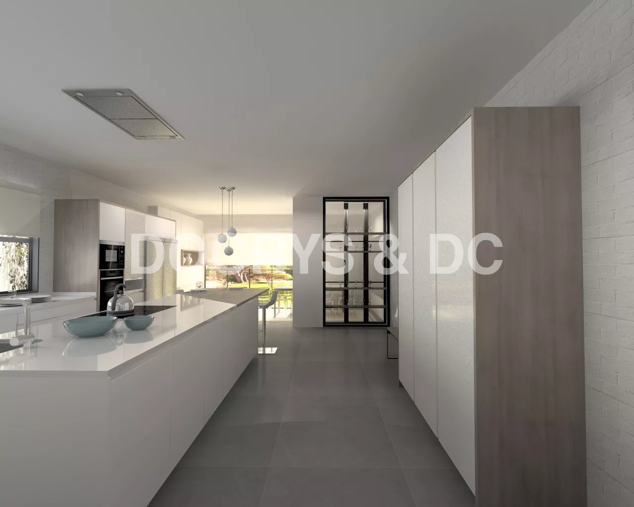 La claridad de los muebles Santos en esta cocina fabricada en Line Seda Mate Blanco junto con su brillante encimera Neolith Artic White, potencia al máximo la iluminación de la estancia llegando a alcanzar cada rincón. Su diseño minimalista de líneas rectas hacen que cobre especial relevancia su gran isla central abarcando la zona de aguas y cocción. De igual forma, su amplio frente situado delante de ésta, presenta una zona de aguas destinado a un uso más frecuente. Las columnas revestidas con madera, y que albergan los electrodomésticos consiguen crear un ambiente más natural y suavizado tan típico del estilo escandinavo. Al final del todo, se añade una pequeña mesa junto con pequeños armarios destinados al almacenaje de accesorios. Por último, destacar una idea muy práctica para las barras, donde se ha recurrido a un hibrido entre mesa e isla que nos ofrece tanto funcionalidad como diseño. Materiales Santos que utilizamos: - LINE SEDA MATE BLANCO. - ENCIMERA NEOLITH ARTIC WHITE.