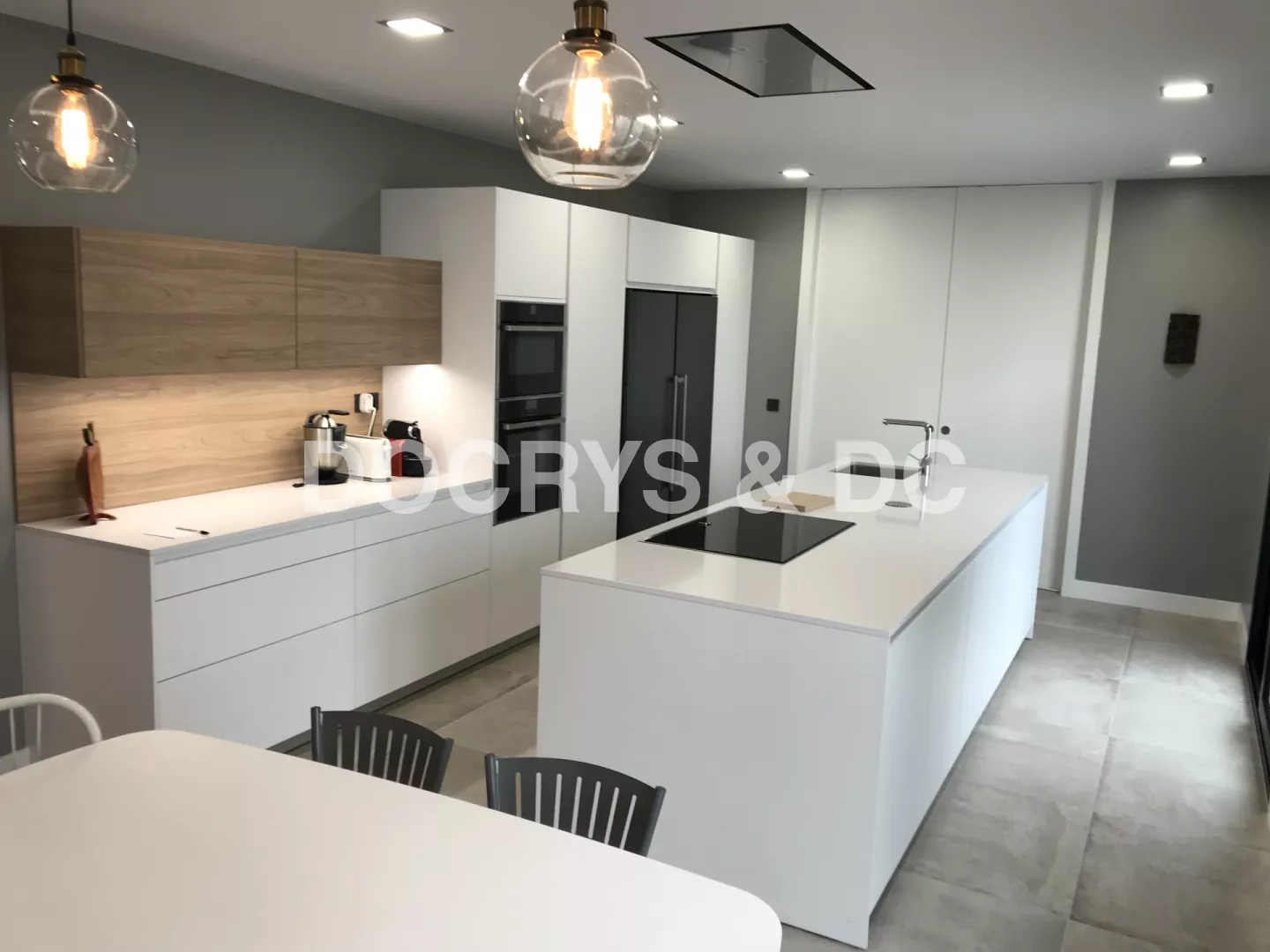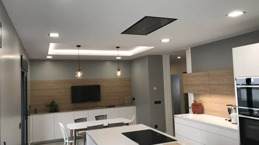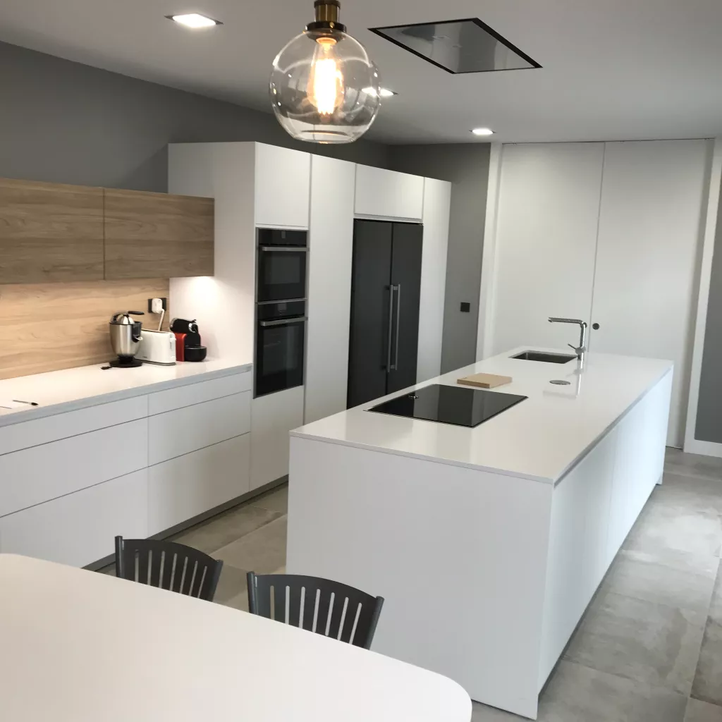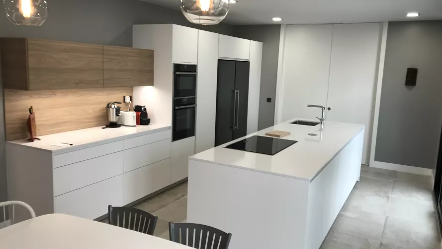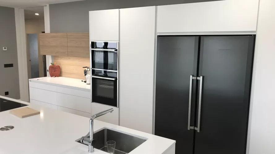 Cocina de estilo contemporáneo donde la belleza reside en la sencillez de su mobiliario. De apariencia ligera y suave se combinan dos modelos de Santos: Line Estratificado Blanco Innsbruk y Line Laminado Olmo Claro en sus muebles altos. Ambos tonos enfatizan la iluminación de la sala, mientras que el olmo potencia la calidez y el contraste. Esta cocina multifuncional ofrece las mejores soluciones de integración y organización gracias a su acertada distribución y geometría exacta. Cuenta con un amplio almacenaje al disponer de un gran número de gavetas y armarios repartidos a lo largo de toda la estancia de una forma estratégica y sencilla. Su diseño y comodidad de uso, se debe en parte a su gran isla central que alberga la zona de cocción y de aguas, además de una amplia superficie de trabajo. Está a su vez, evita al usuario realizar largos desplazamientos y le permite trabajar de forma conjunta con otras personas, convirtiéndose así en el eje más versátil de toda la estancia. Su zona comedor se encuentra delimitada por cuatro focos y una enorme tira de luz LED que remarca el ambiente. Éste se compone de un largo frente de armarios bajos y una ovalada mesa comedor en blanco y patas en madera. De esta forma, la cocina se convierte en el centro neurálgico de la vivienda en el que pasar tiempo en familia resulta ser una agradable experiencia, no sólo por su funcionalidad, sino también por su espectacular diseño y belleza. LINE ESTRATIFICADO BLANCO INNSBRUK LINE LAMINADO OLMO CLARO ENCIMERA SILESTONE BLANCO ZEUS