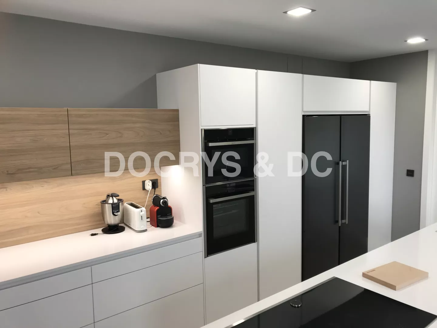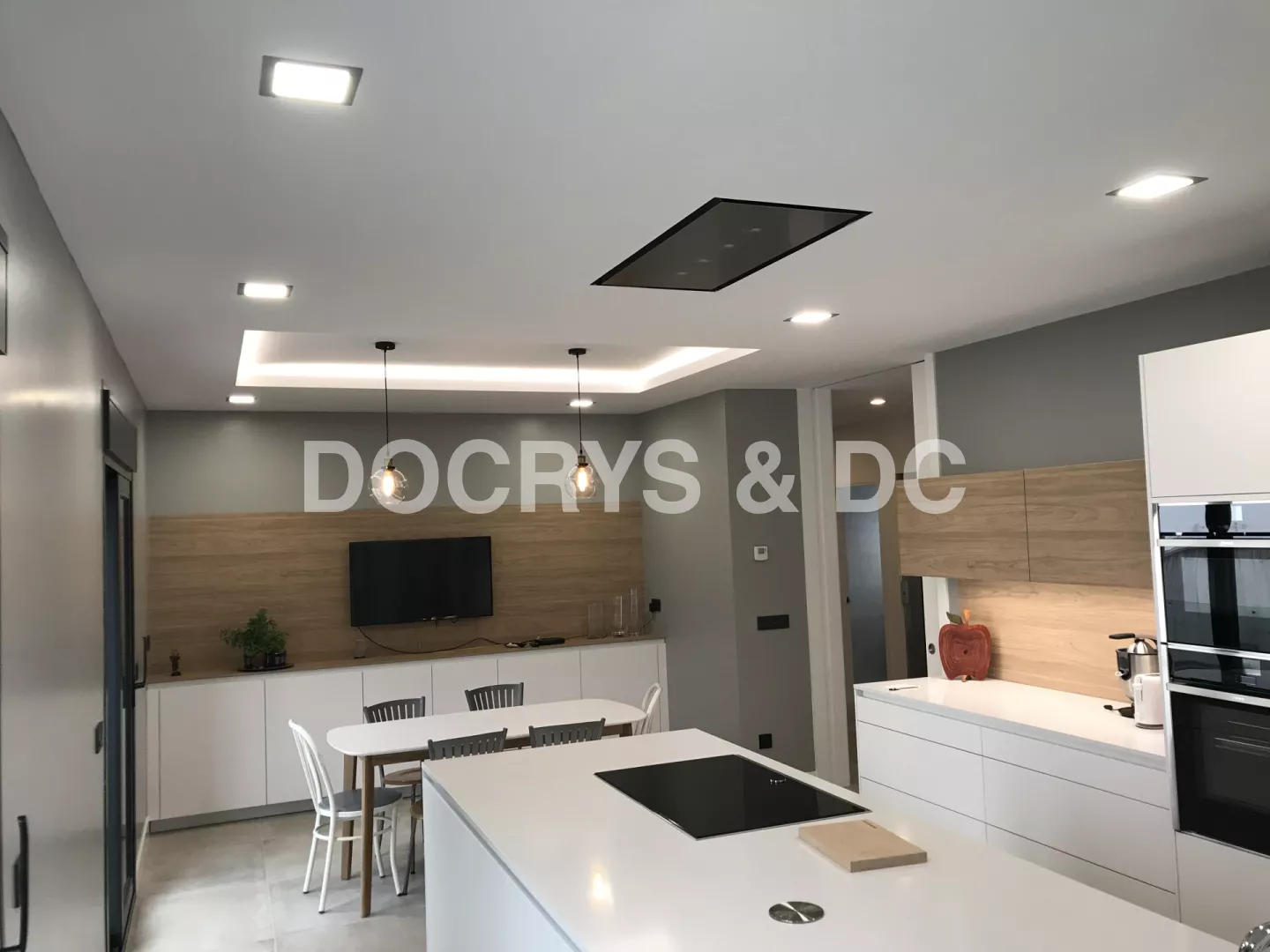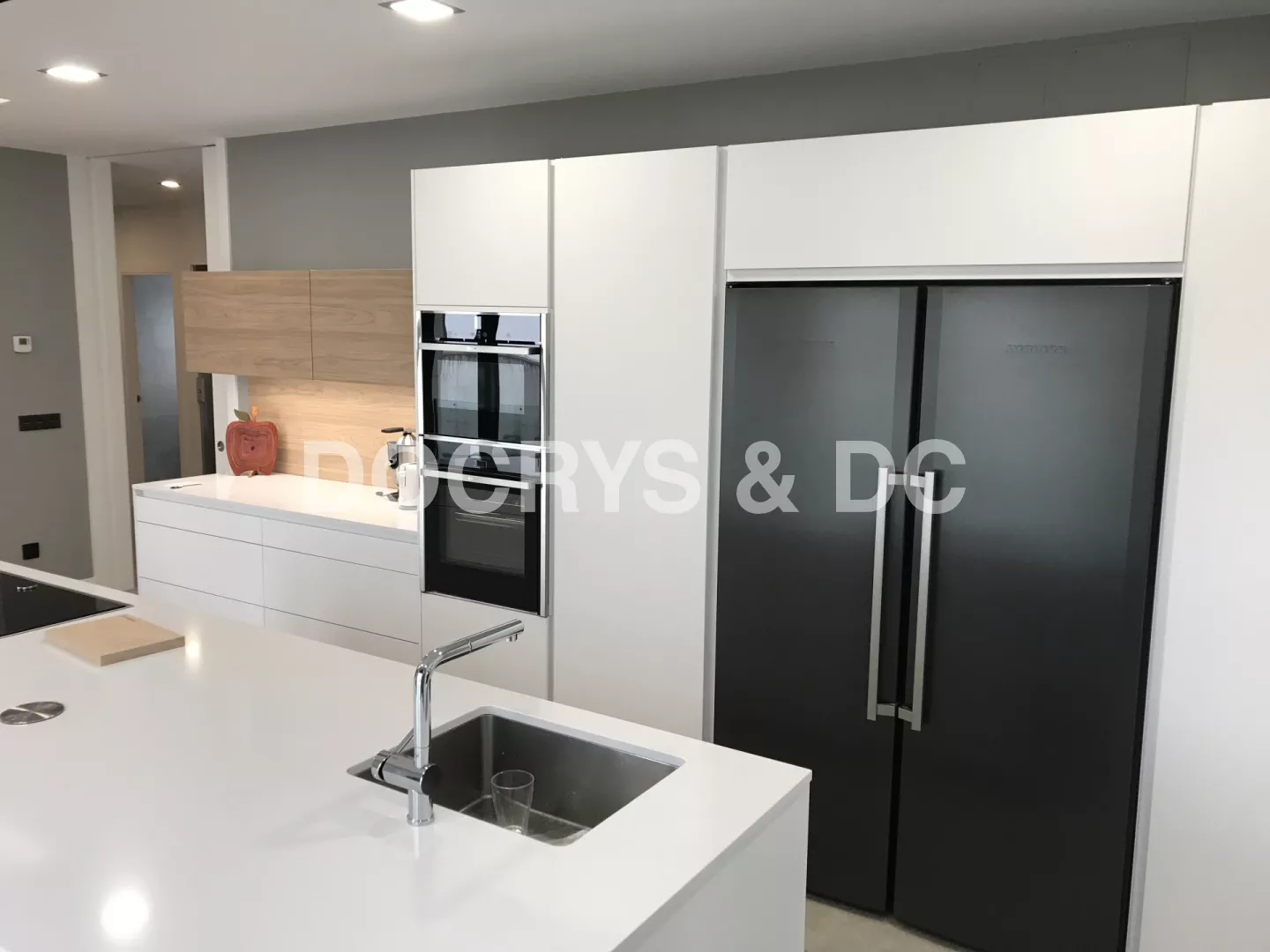Cocina de estilo contemporáneo donde la belleza reside en la sencillez de su mobiliario. De apariencia ligera y suave se combinan dos modelos de Santos: Line Estratificado Blanco Innsbruk y Line Laminado Olmo Claro en sus muebles altos. Ambos tonos enfatizan la iluminación de la sala, mientras que el olmo potencia la calidez y el contraste. Esta cocina multifuncional ofrece las mejores soluciones de integración y organización gracias a su acertada distribución y geometría exacta. Cuenta con un amplio almacenaje al disponer de un gran número de gavetas y armarios repartidos a lo largo de toda la estancia de una forma estratégica y sencilla. Su diseño y comodidad de uso, se debe en parte a su gran isla central que alberga la zona de cocción y de aguas, además de una amplia superficie de trabajo. Está a su vez, evita al usuario realizar largos desplazamientos y le permite trabajar de forma conjunta con otras personas, convirtiéndose así en el eje más versátil de toda la estancia. Su zona comedor se encuentra delimitada por cuatro focos y una enorme tira de luz LED que remarca el ambiente. Éste se compone de un largo frente de armarios bajos y una ovalada mesa comedor en blanco y patas en madera. De esta forma, la cocina se convierte en el centro neurálgico de la vivienda en el que pasar tiempo en familia resulta ser una agradable experiencia, no sólo por su funcionalidad, sino también por su espectacular diseño y belleza. LINE ESTRATIFICADO BLANCO INNSBRUK LINE LAMINADO OLMO CLARO ENCIMERA SILESTONE BLANCO ZEUS