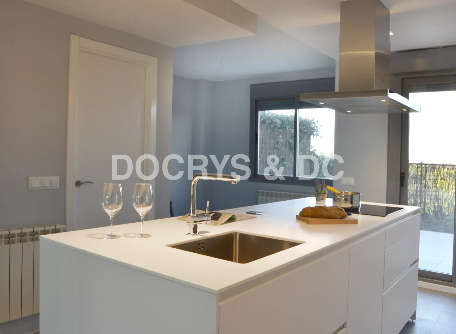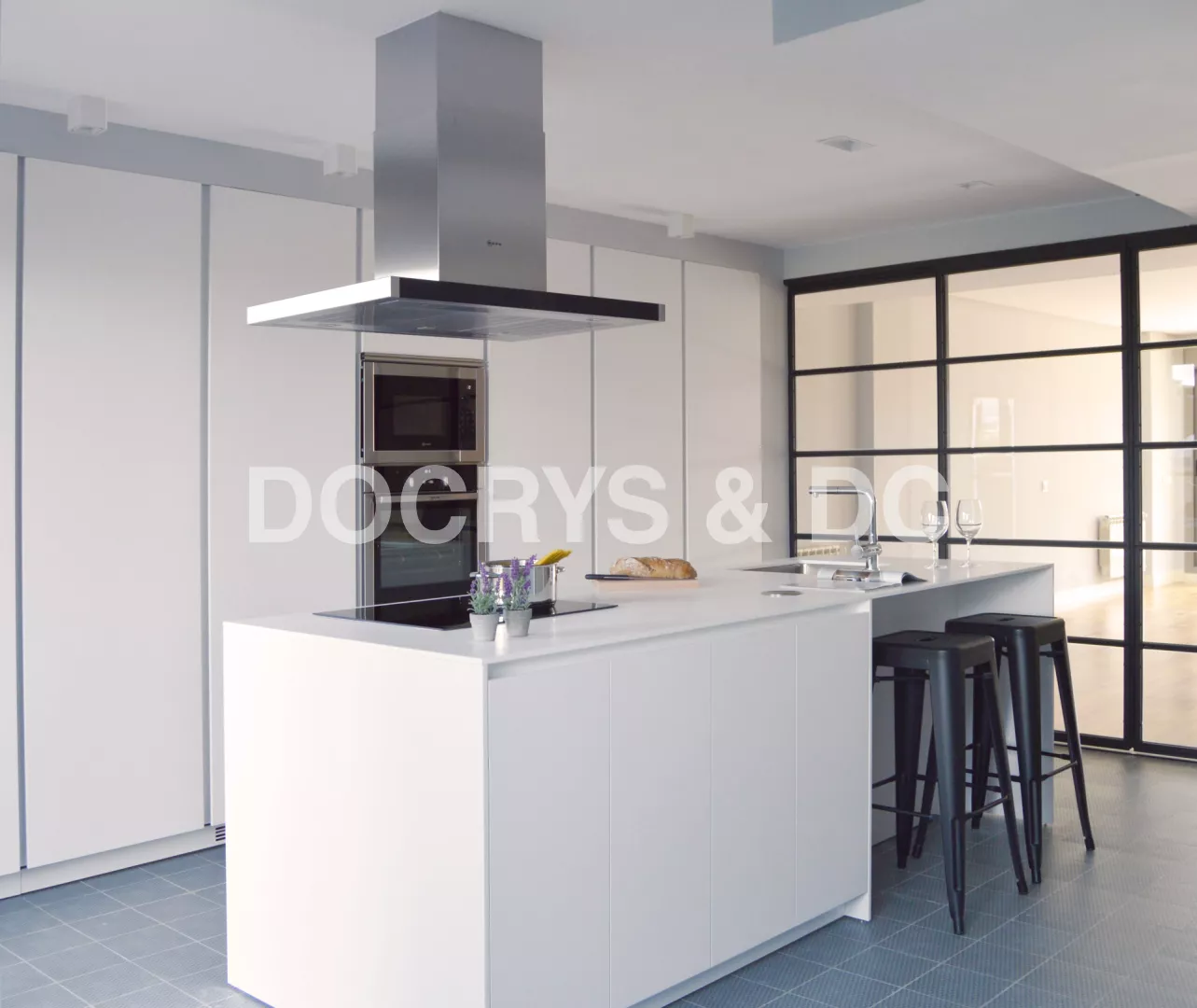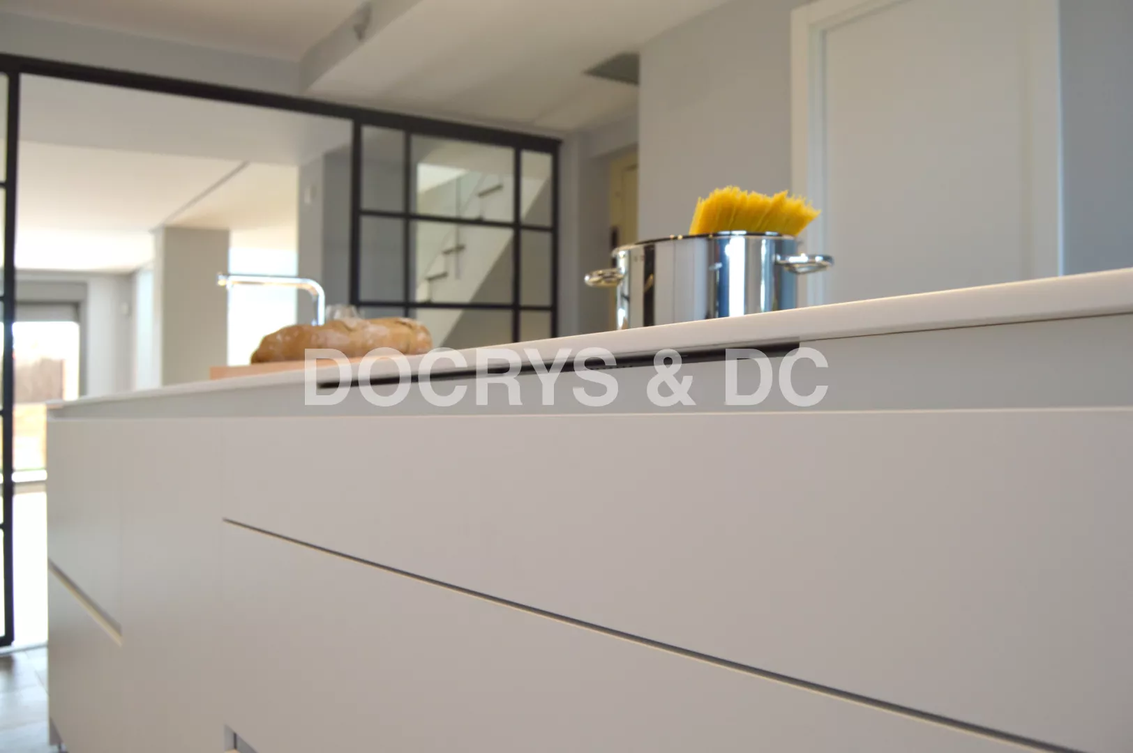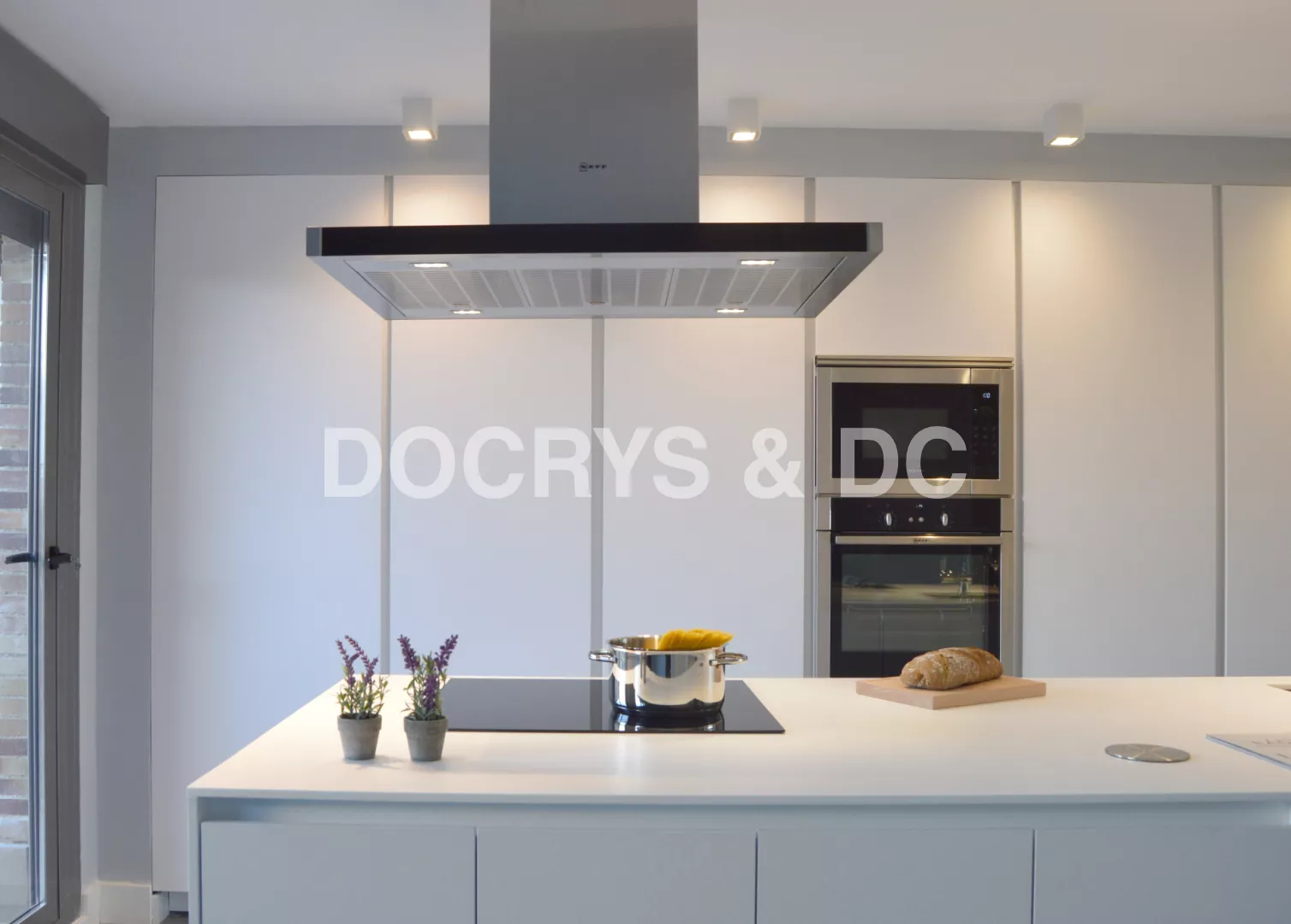 Las islas de cocinas son sin duda una de las mejores opciones por su comodidad, funcionalidad y estilo moderno. En este innovador diseño de cocina Santos se ha utilizado el Estratificado Blanco Innsbruk y encimera Dalian Blanco Glaciar con el objetivo de potenciar al máximo el espacio y de conseguir un mayor almacenaje.