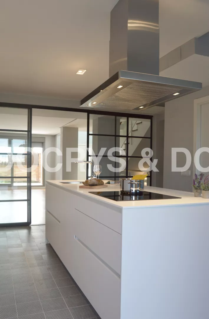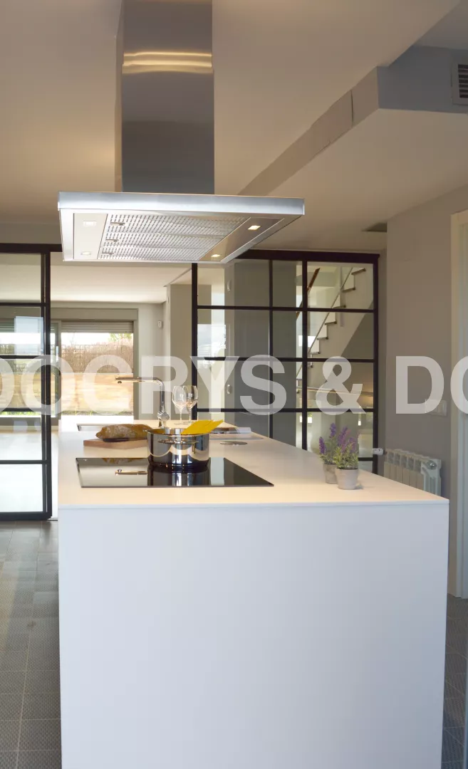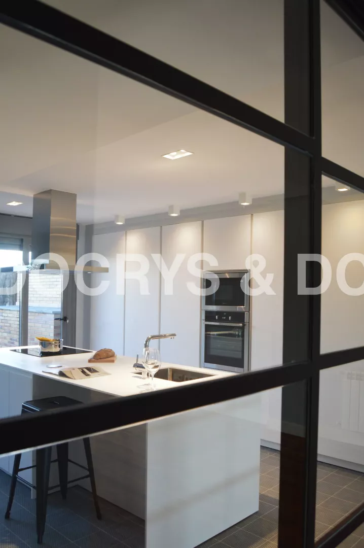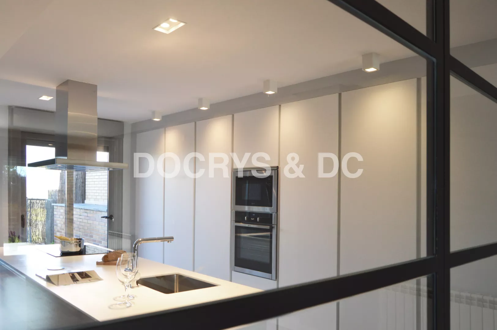 La libertad de movimiento, la posibilidad de compartir tareas sin agobios y de socializar hacen que podamos disfrutar plenamente del corazón de nuestro hogar. Su suelo porcelánico de detalles geométricos se fusiona a la perfección con el resto del conjunto, aportando una nota de color y contraste en la estancia. Lo mismo ocurre con sus espectaculares cerramientos de hierro y cristal que resultan idóneos para delimitar ambos ambientes de una forma elegante, sencilla y con cierto toque industrial.
