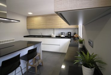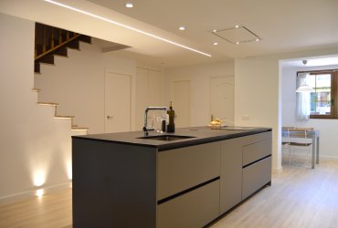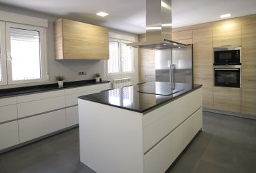 Cocina Santos gris y madera con isla y encimera de Neolith Cocina Santos gris y madera con isla central y mesado