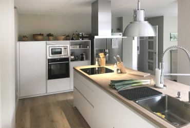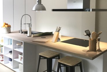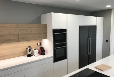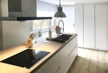 Cocina Santos blanca y madera con encimera de Neolith Cocina Santos blanca con encimera Neolith
