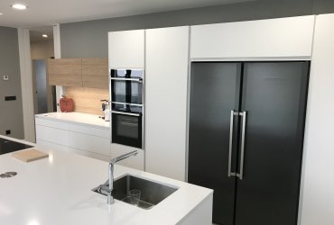 Cocina Santos blanca con isla y encimera Sapiestone Cocina Santos blanca con isla y encímela Sapiestone