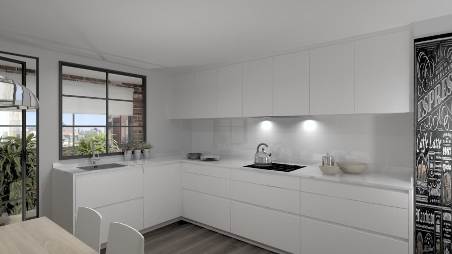 Cocina en laminado seda blanco modelo Santos Line con encimera blanca Silestone Cocina en laminado seda blanco modelo Santos Line con encimera blanca Silestone